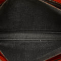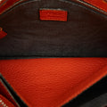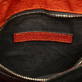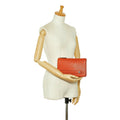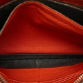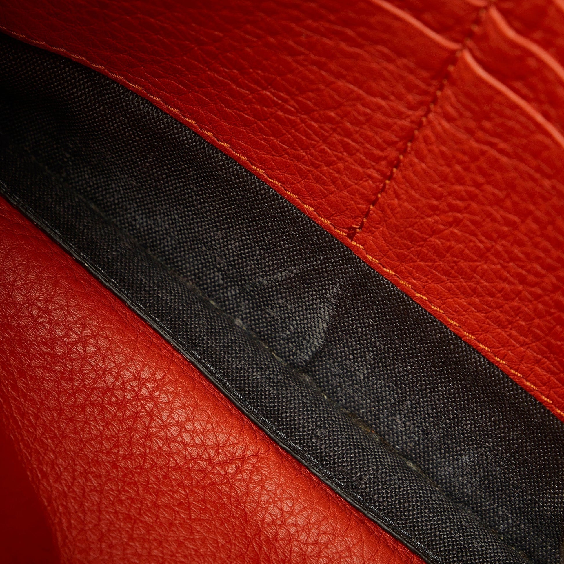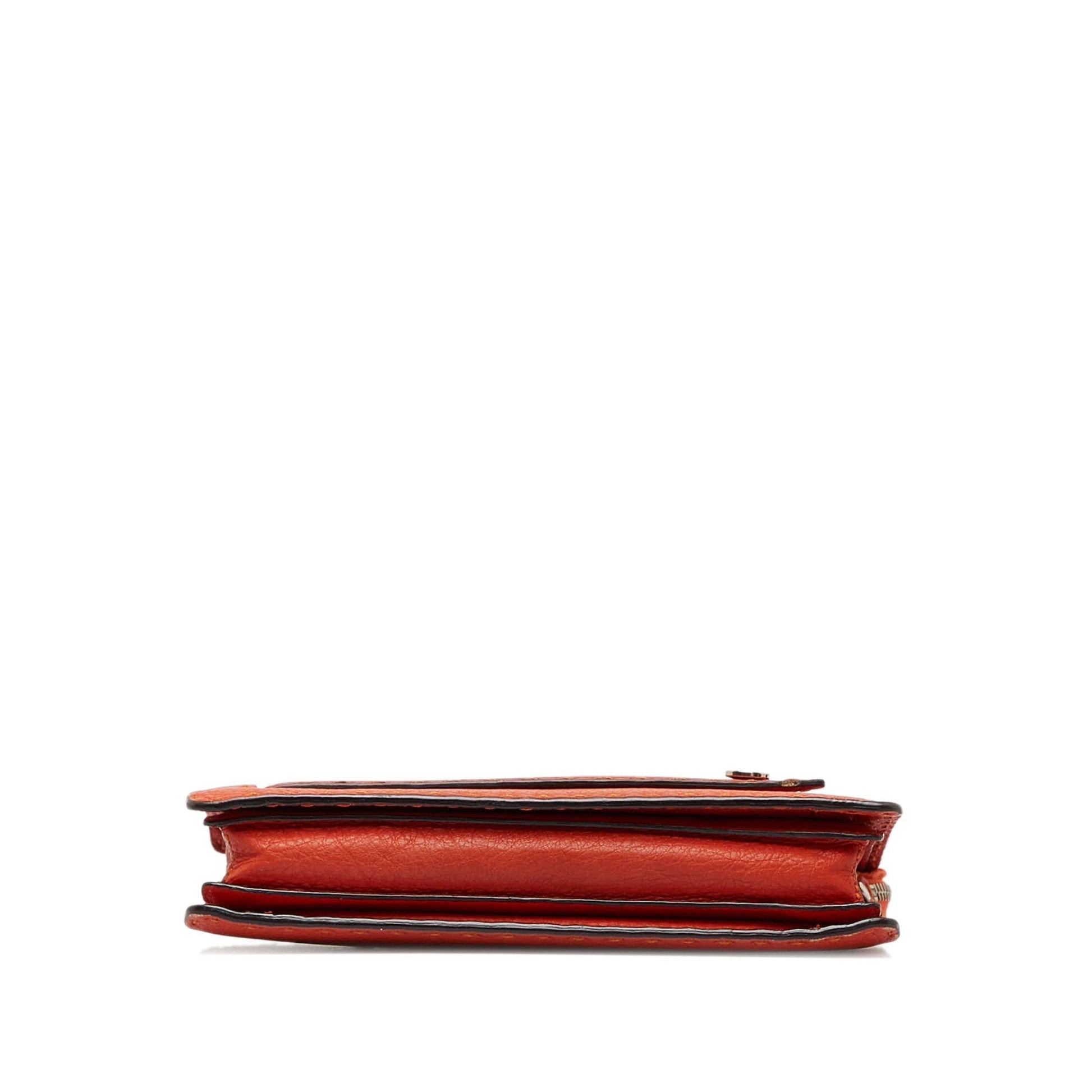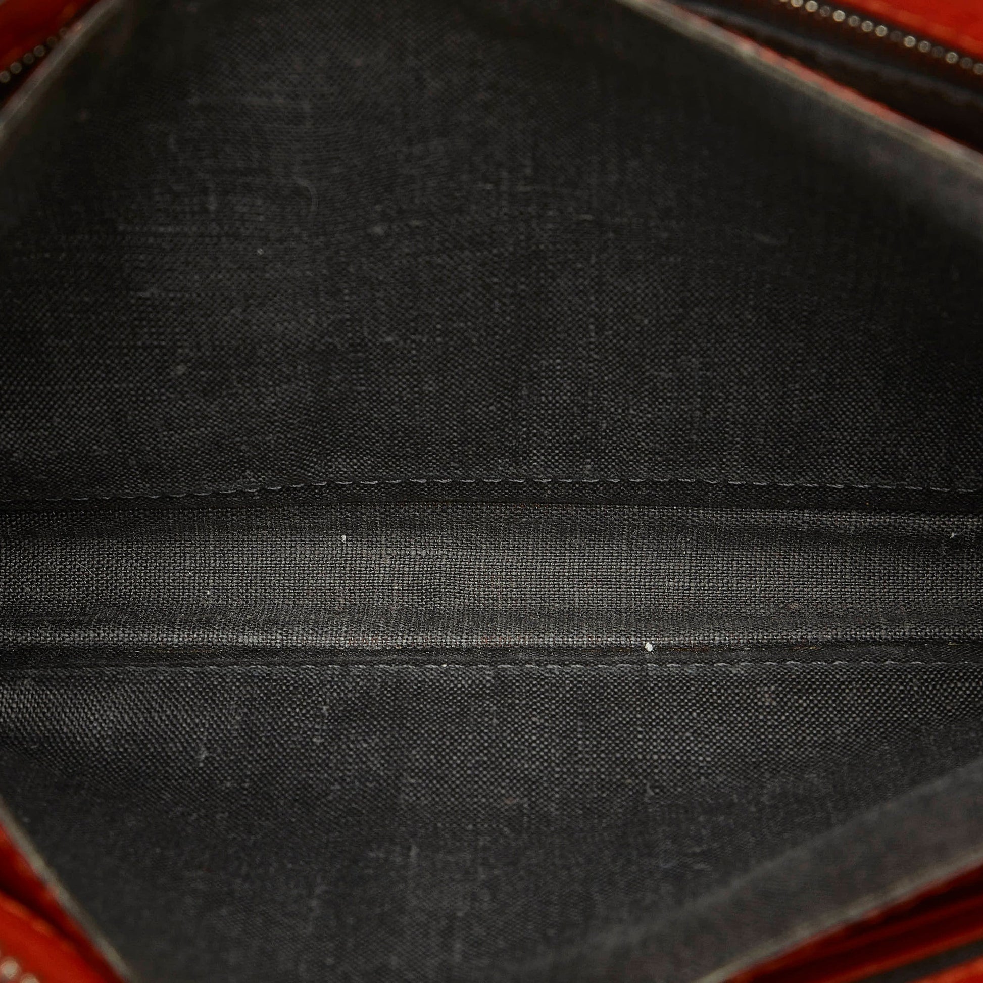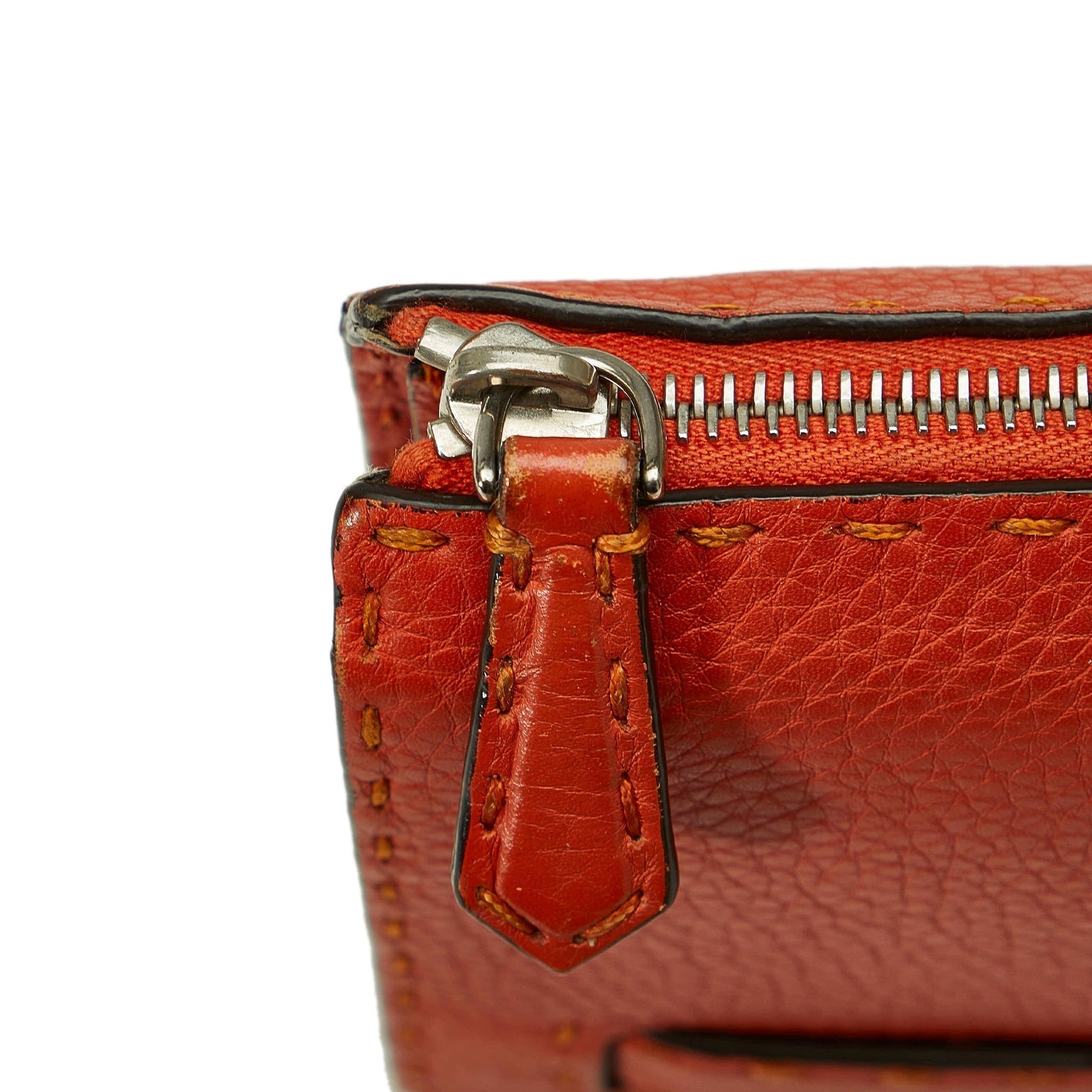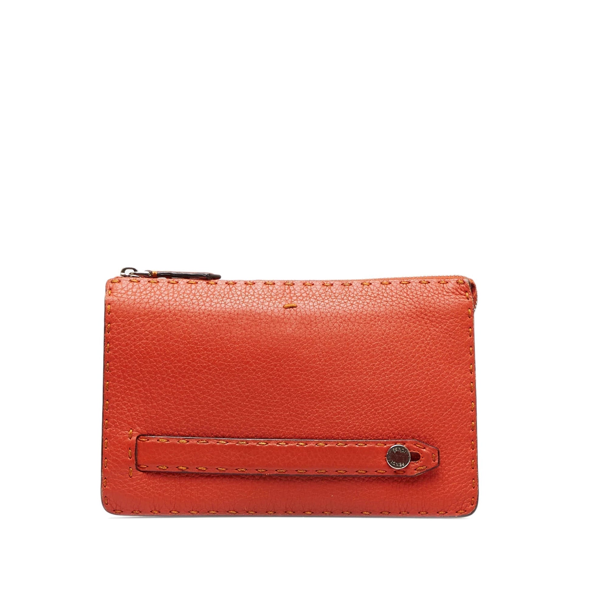 This clutch bag features a leather body, a top zip closure, and interior zip and slip pockets.