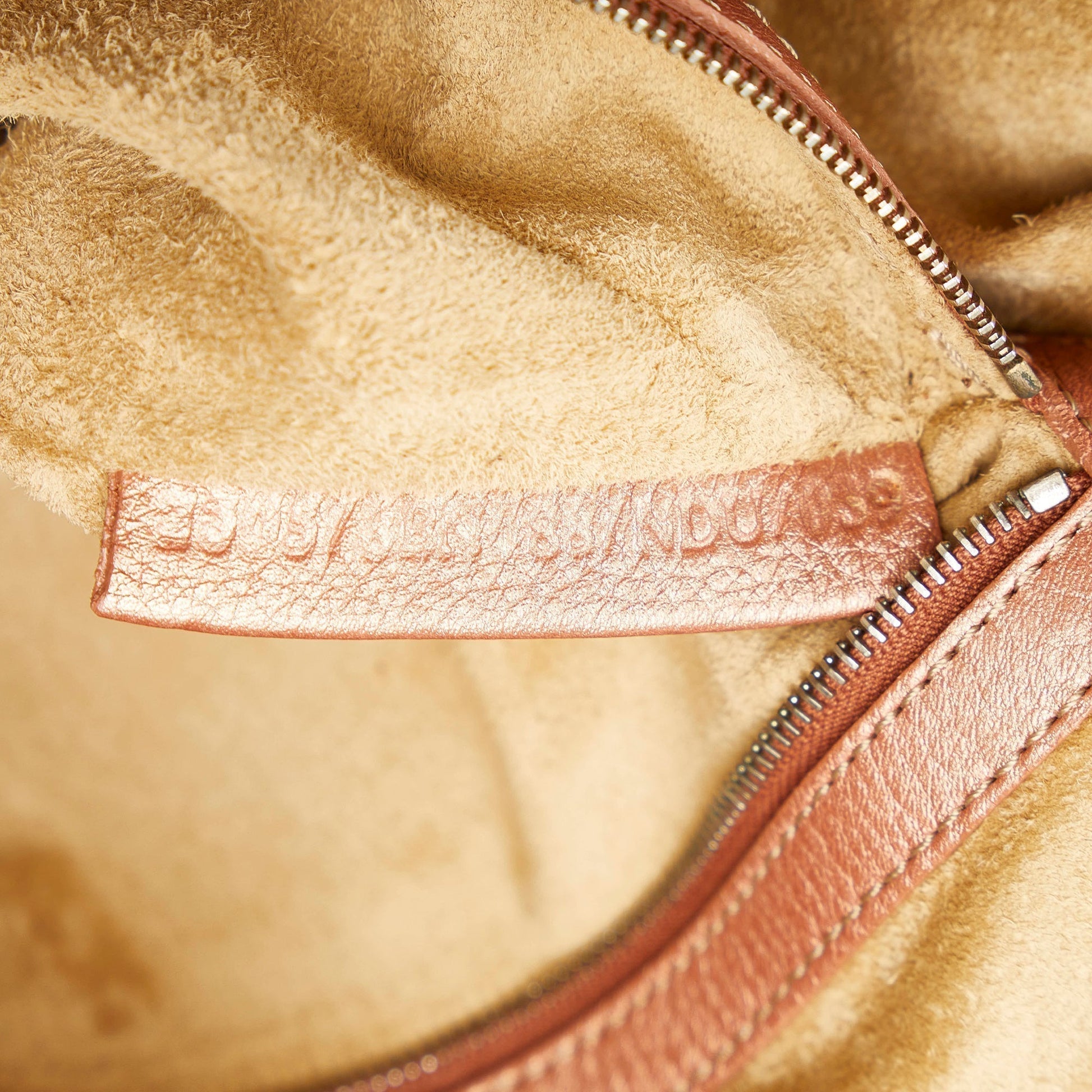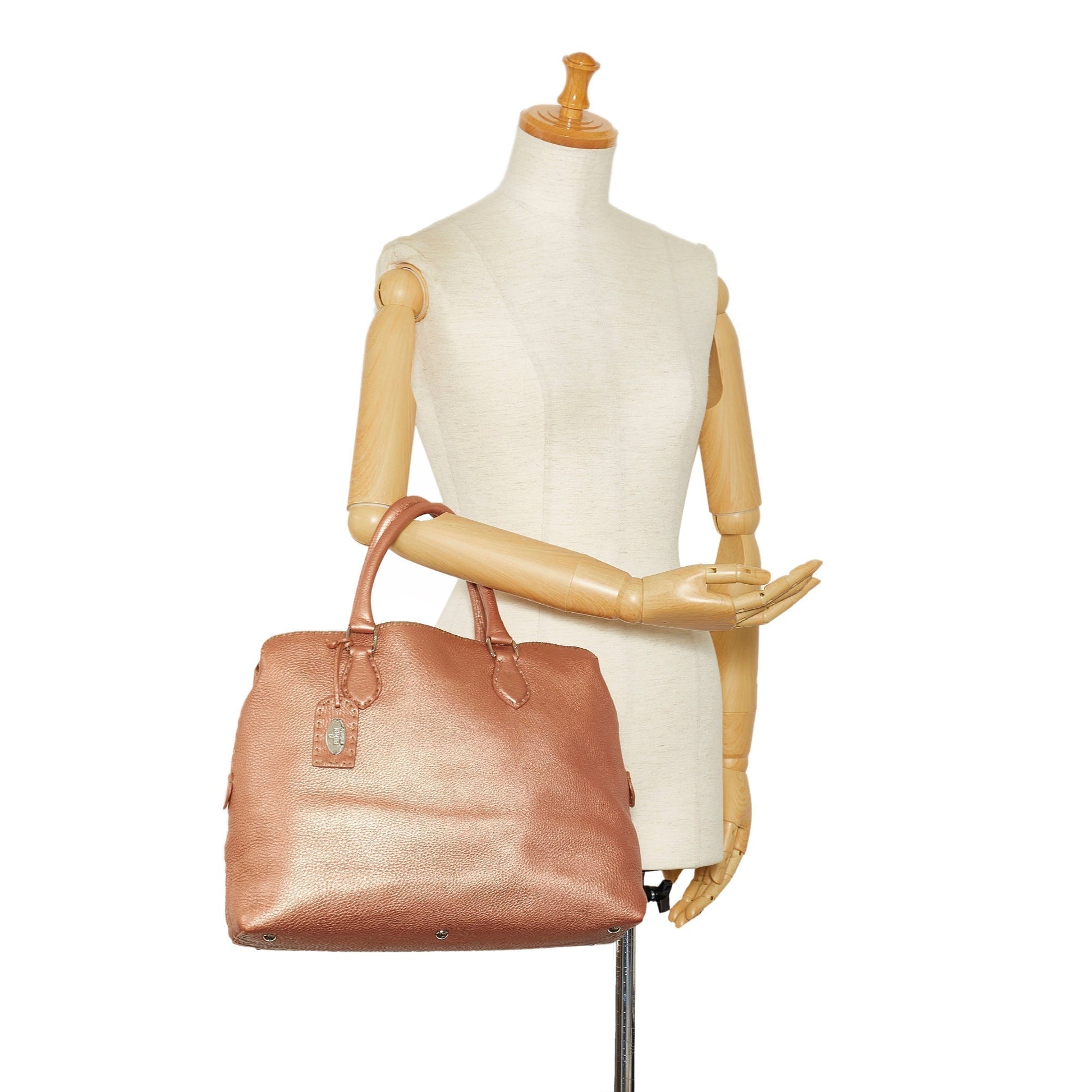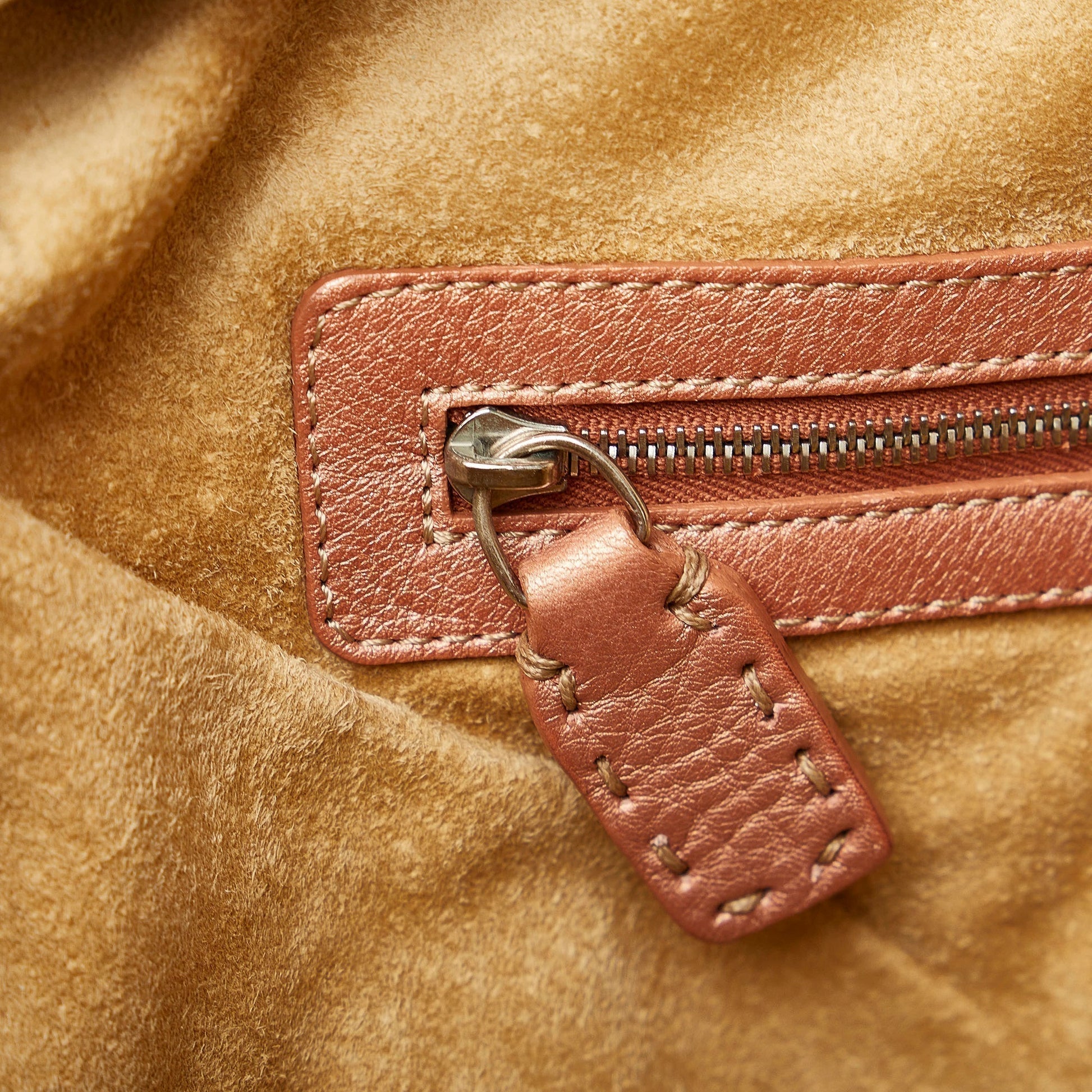 This tote bag features a leather body, rolled leather straps, an open top, and an interior zip pocket.