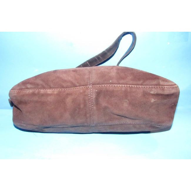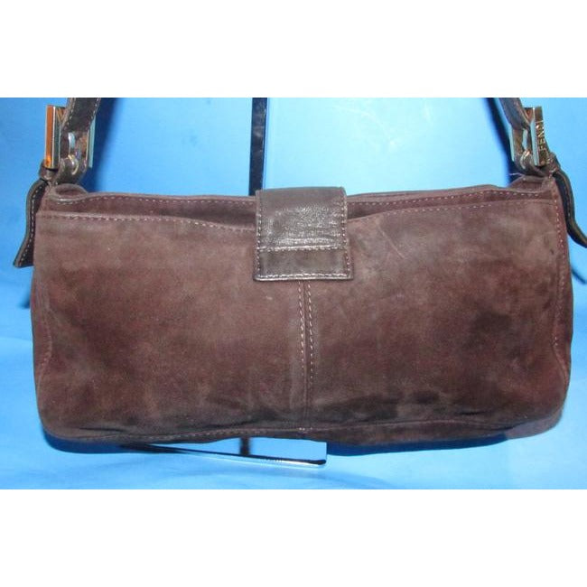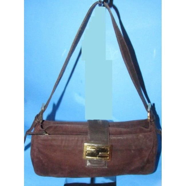 This bag is made of rich brown suede and leather with a two-tone, gold and chrome, FF logo clasp! It is a hobo style shoulder bag with an exterior pocket. At the center, there is a wide brown leather strap where the gold, FF logo snaps close to secure it. It has an adjustable leather shoulder strap, engraved chrome hardware, and is in excellent condition- don't miss out!