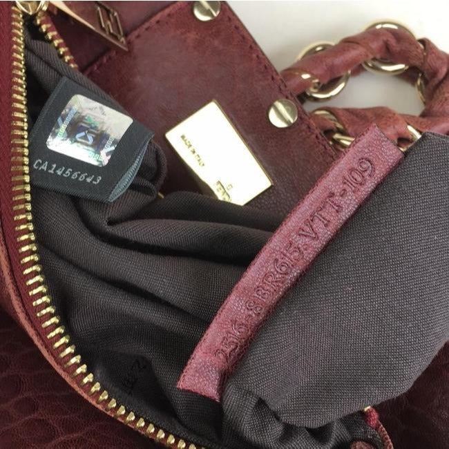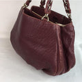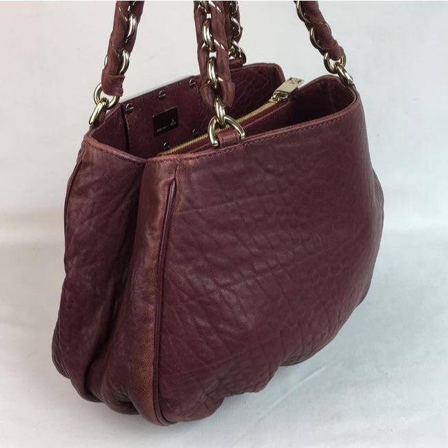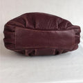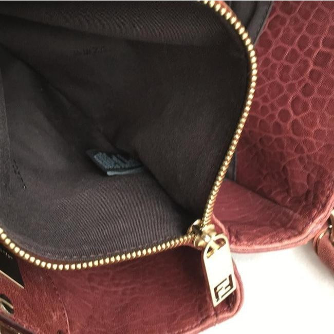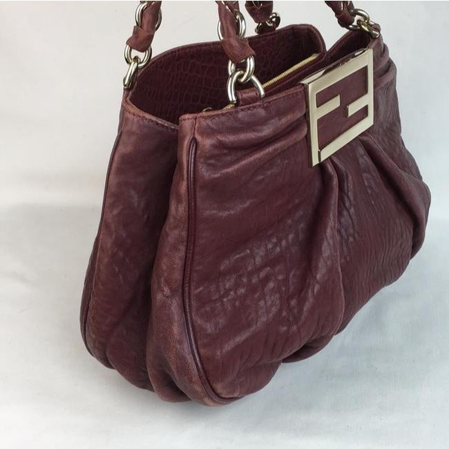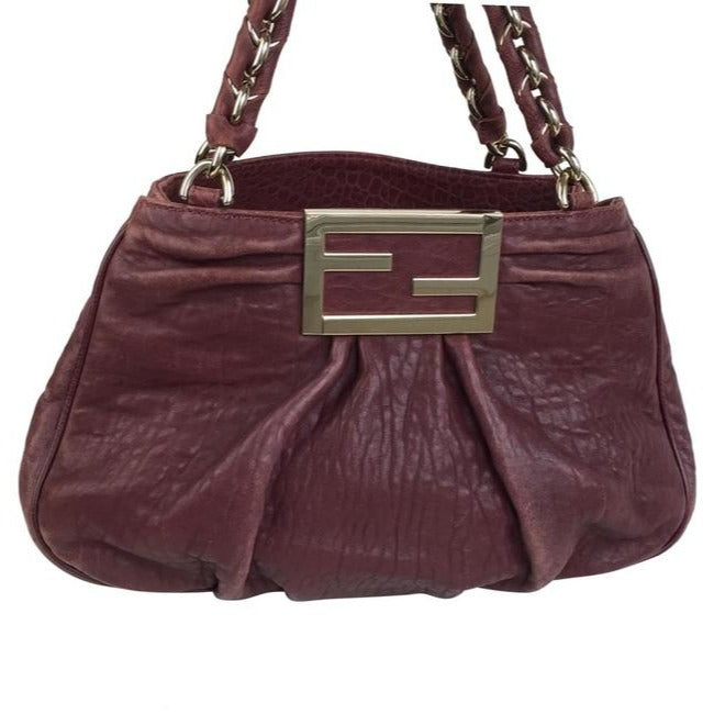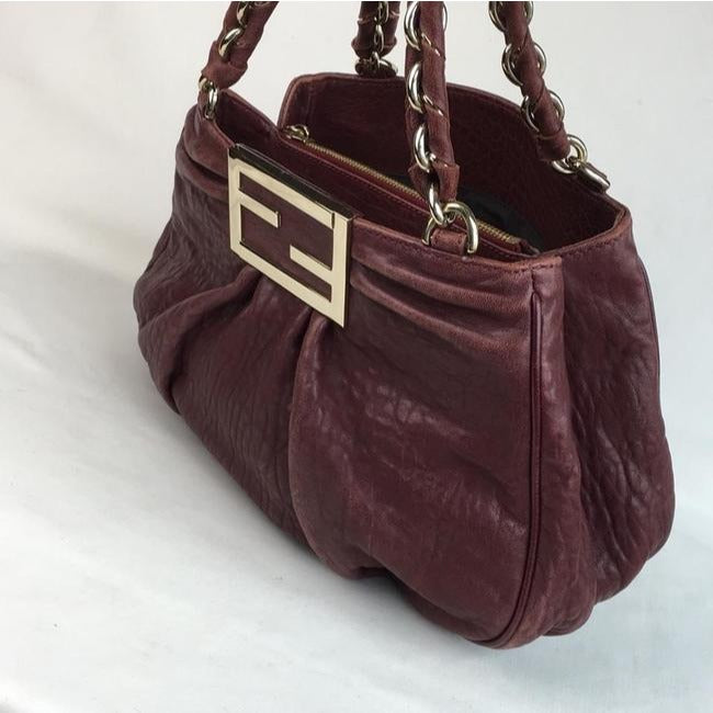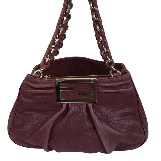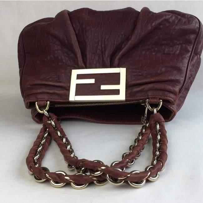 This bag is made of rich plum leather with a deliberately distressed appearance and a gold FF logo accent! It is an open top hobo style shoulder bag with two straps made of leather and gold chain. At the bottom it is ruched at the corners, so it can hold quite a bit. It has muted gold hardware throughout, engraved Fendi logo hardware, and is in mint condition- don't miss out!