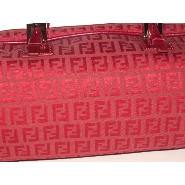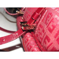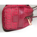 This top zip, medium, top handle, satchel style bag can be worn hand held or as a shoulder bag. It is a darker red color with an embroidered FF logo design throughout the canvas with rose gold accents. The accents by the zipper, piping, and strap are all leather. The purse is in fabulous condition!