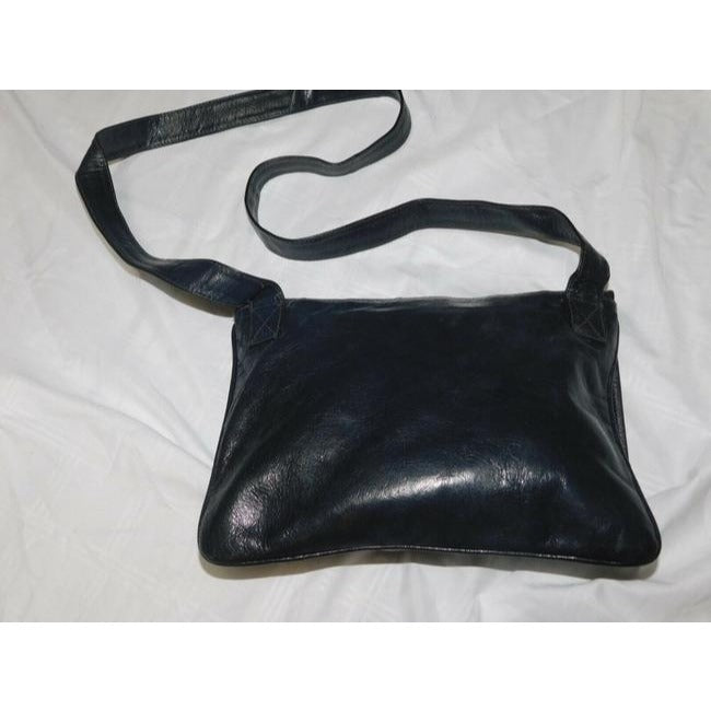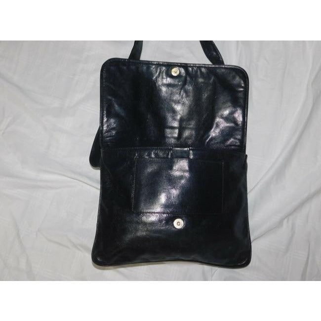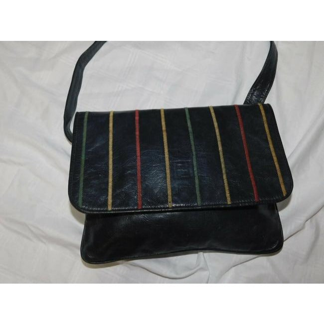 The bag is unique- not like the usual vintage designer purses you will find by Fendi. It is definitely from the 1970's- 1980's. The purse is made of a buttery navy leather that has a design of stripes of red, green, and yellow stitching on one side of the envelope top with the FF logo embossed at the center. Under the envelope top is an exterior pocket in the front. It is solid navy blue leather on the other side. It has a magnetic snap closure and the shoulder strap is not adjustable.