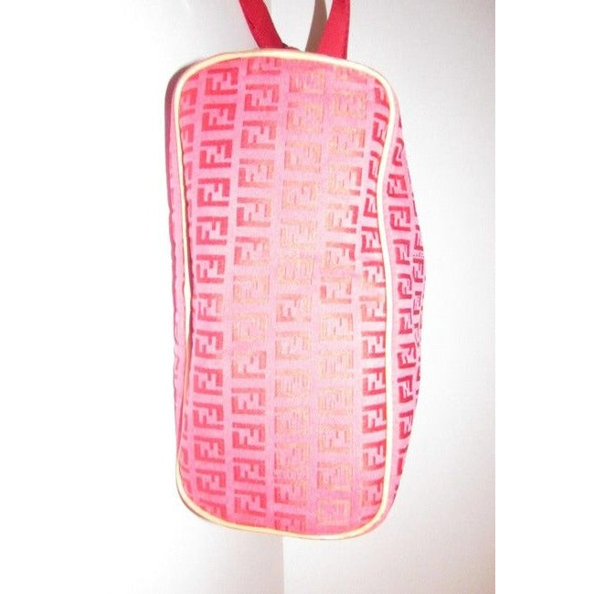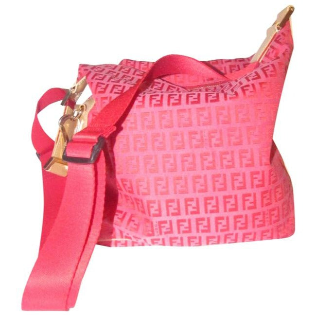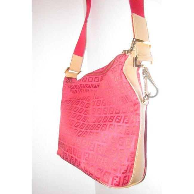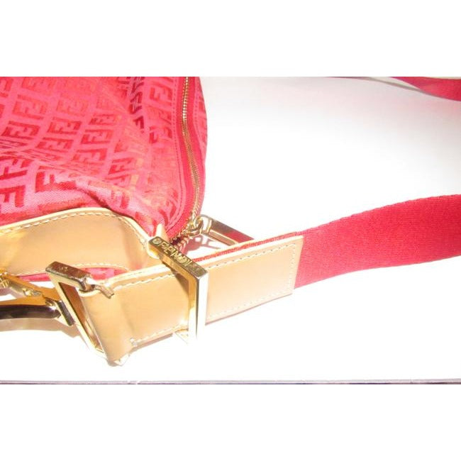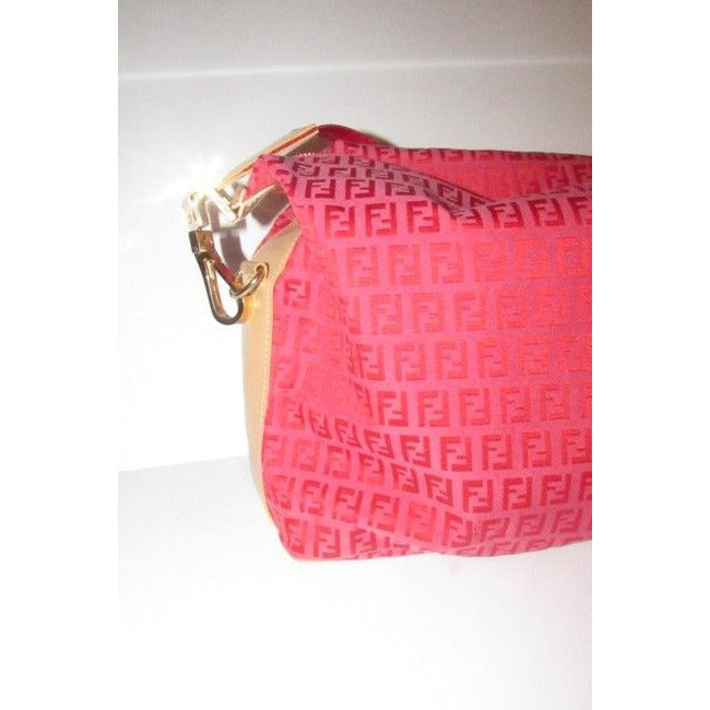 The bag is a classic purse by Fendi in a must-have color combination and print! It is an XL size, cross body or shoulder bag with a wide, longer red heavy canvas strap, in a classic, top zip hobo style! It is made with heavy canvas fabric with the Zucchino or small 'F' logo design in red on a deep salmon pink background with camel leather. It has a zip top style closure and gold accents and hardware.