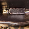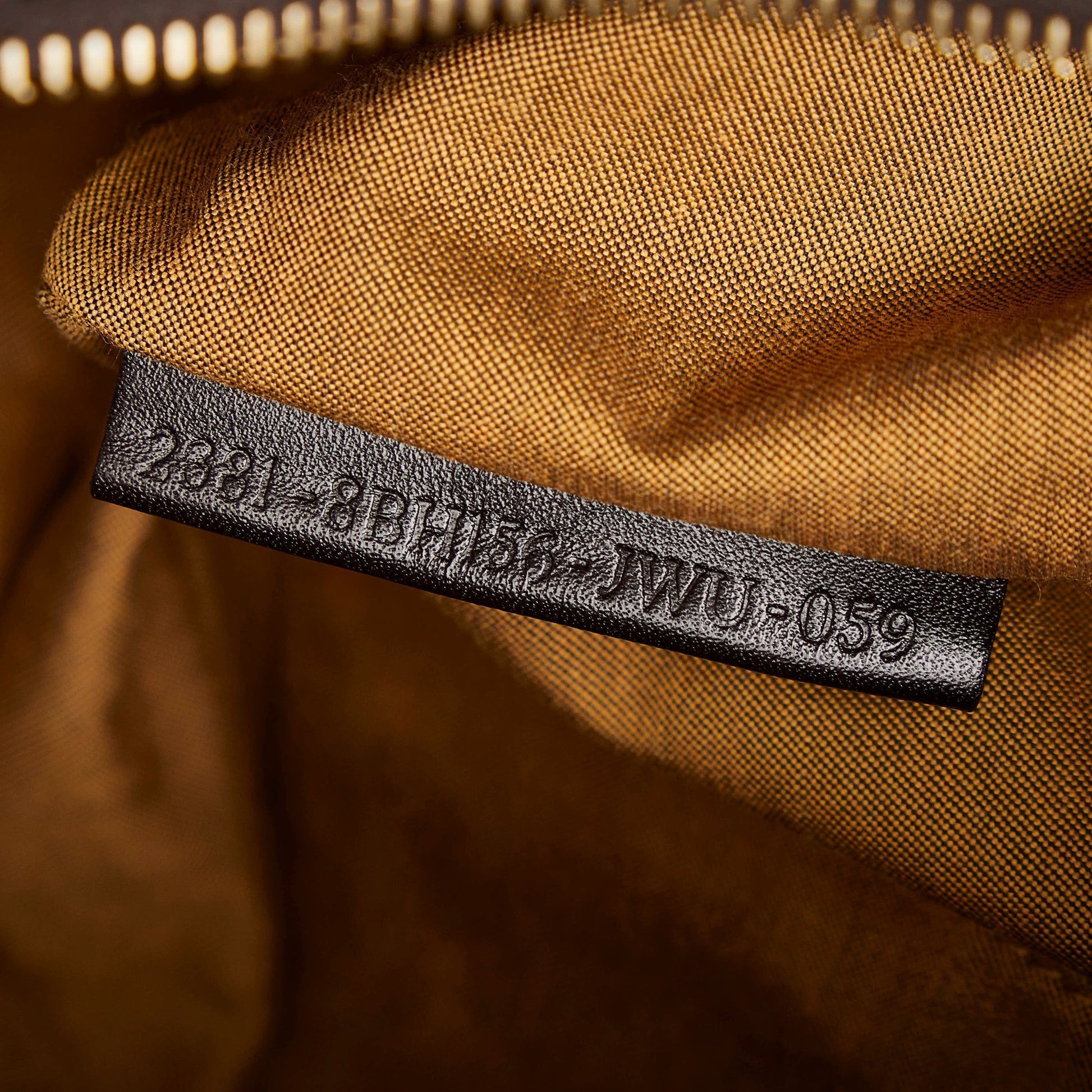 This tote bag features a canvas body with leather trim, flat leather straps with gold tone hardware, a top zip closure, and an interior slip pocket. Comes with dust bag