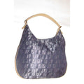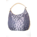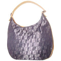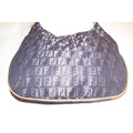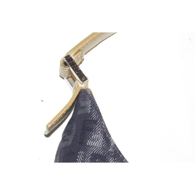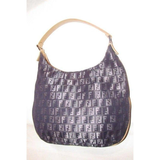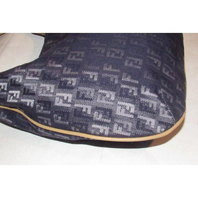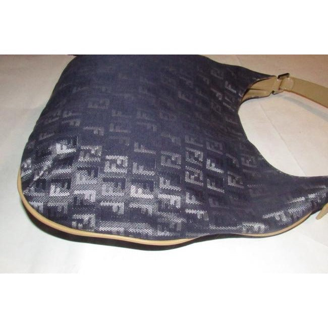 The bag is the perfect, organic shaped, Fendi large hobo that no one else will have! The purse is made of Zucchino or small F logo print canvas in shades of blues and grey and camel leather. It has a leather strap that cannot be adjusted and chrome hardware!