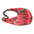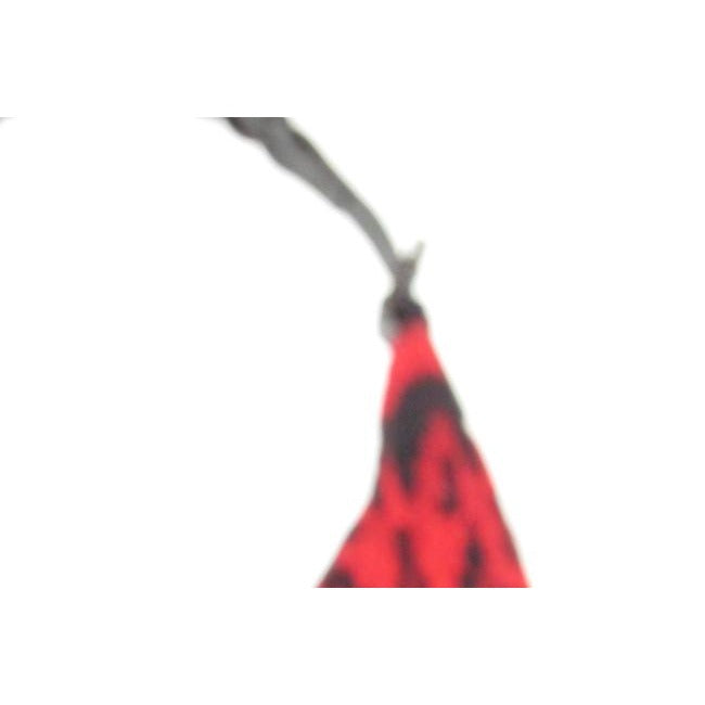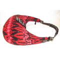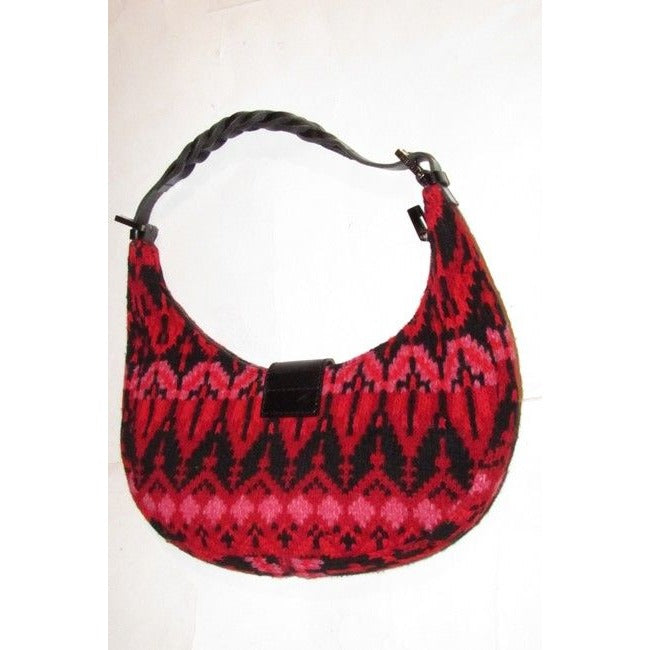 The bag is a medium, hobo style, shoulder style purse in a red, pink, and black geometric design wool and black leather. It has a zip close top as the primary closure and a leather strap that goes over the zip closure at the center with a chrome FF accent over the secondary snap closure. The purse has black leather accents as the strap, the snap closure FF logo wide center strap with gunmetal accents. The strap is a braided style that is both adjustable and removable and the hardware has a gunmetal finish.