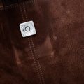 This shoulder bag features a suede body, an exterior front slip pocket with a leather strap and snap closure, a flat leather strap, a top zip closure, and an interior zip pocket.