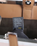 It features double flat leather handles with a tirette/clochette/metal tag dangling from one side, four rectangular metal details at the upper side, top snap button which opens to a brown suede lined interior compartment with a zip and two patch pockets, five protective base studs, and silver tone hardware.
