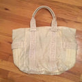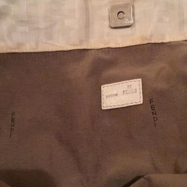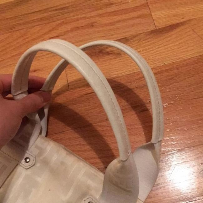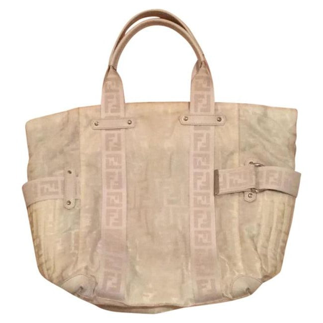 The bag is a classic tote style purse by Fendi in a must-have color combination and print! It is a larger size with two longer leather and canvas handles in a graduated satchel or tote shape! It is a handheld or shoulder bag made with heavy canvas fabric with the Zucco or large 'F' logo design in ivory and muted purple with two, smooth, ivory leather at the handles and the base. It has a snap top closure and chrome accents and hardware. There are two exterior pockets and the fabric is quilted in areas of the tote around the pockets.