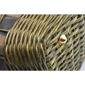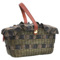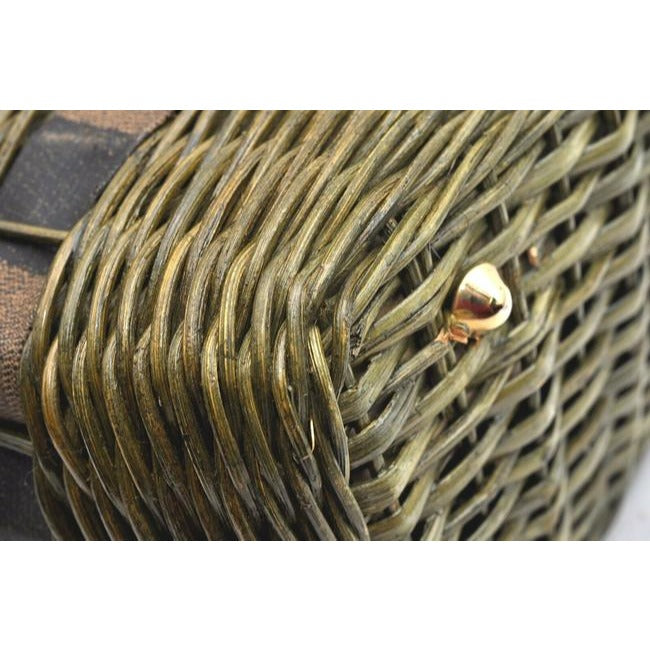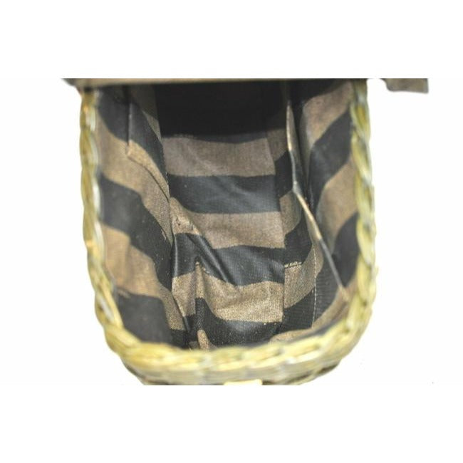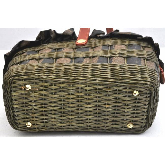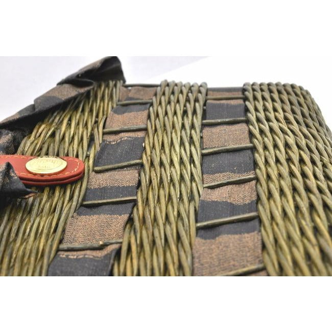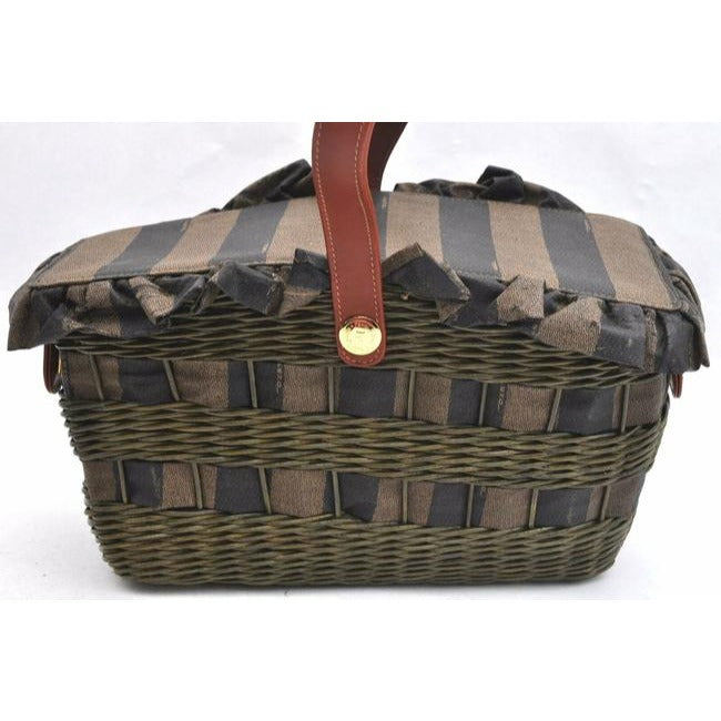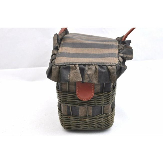The bag is a rare style by Fendi because of the use of raffia or wicker, which they have brought back in their recent fall/winter line! It is an XL graduated basket shaped handheld or shoulder bag made with raffia, pequin striped print material throughout and leather in burnt orange. The top has a snap closure and it has a footed bottom.