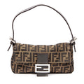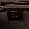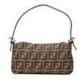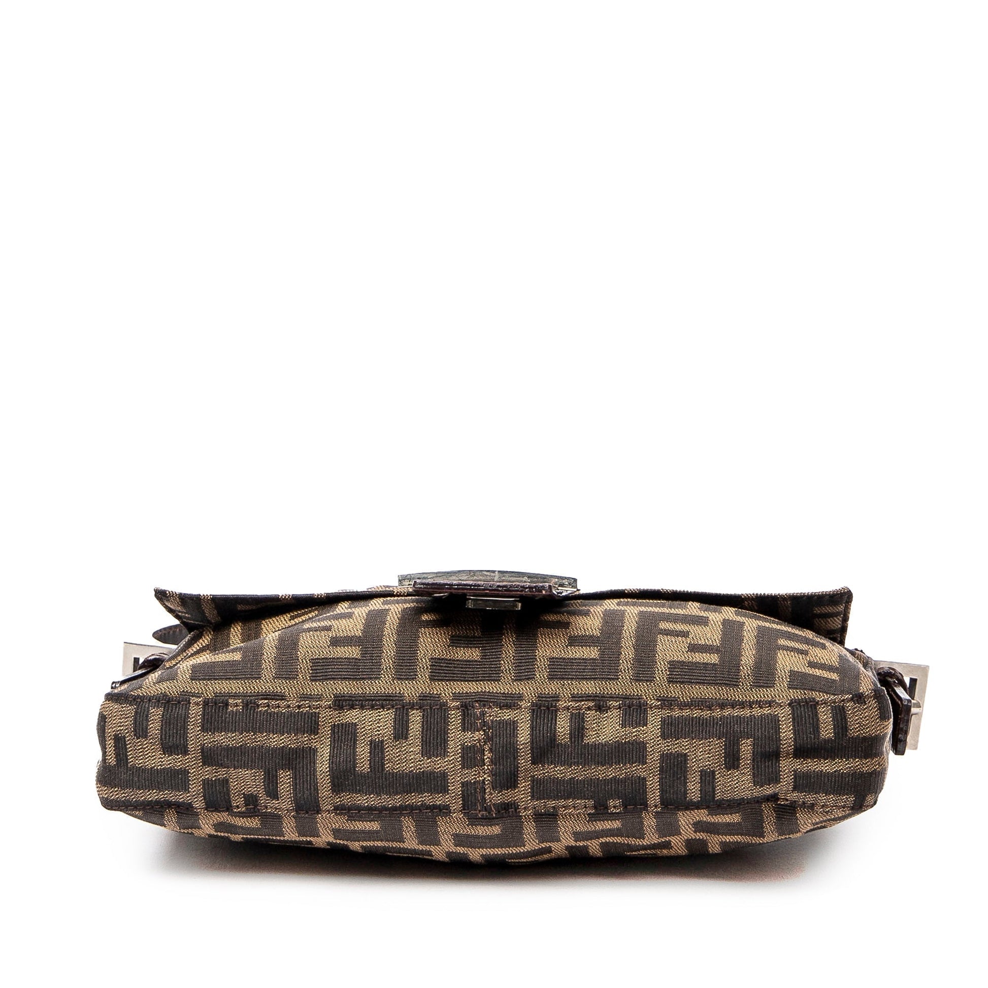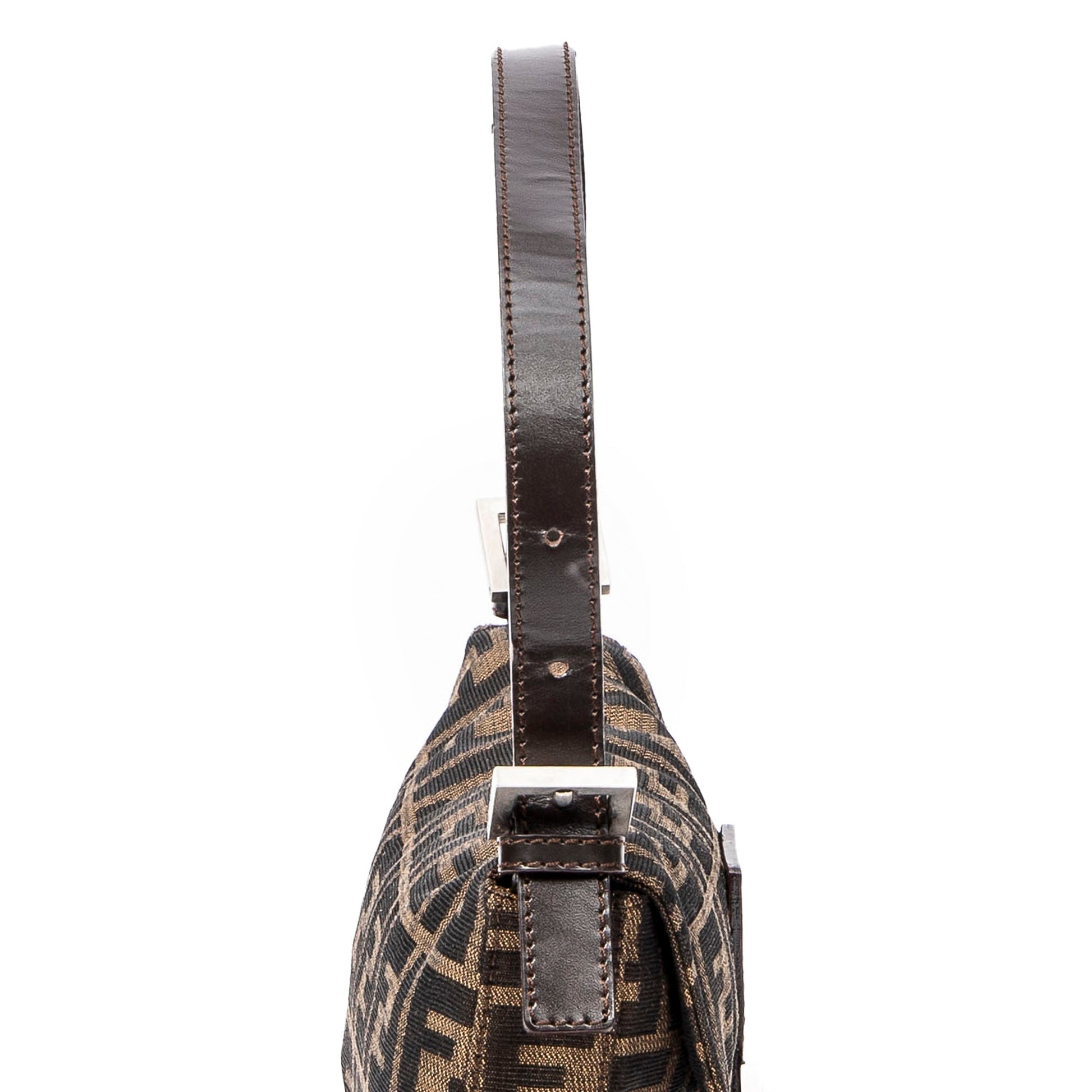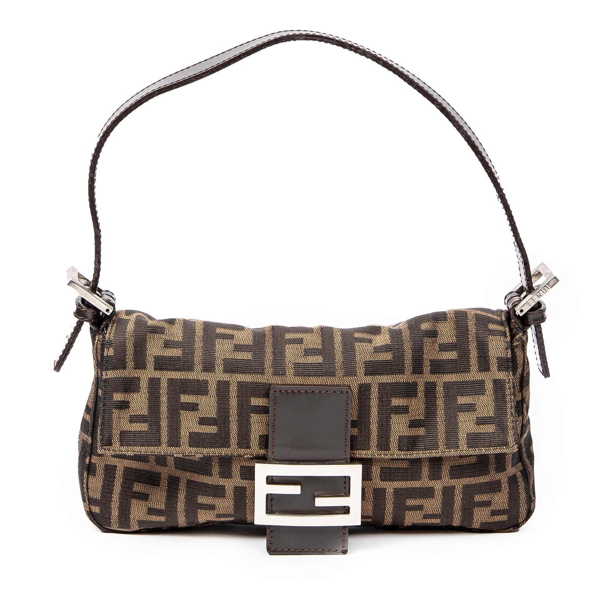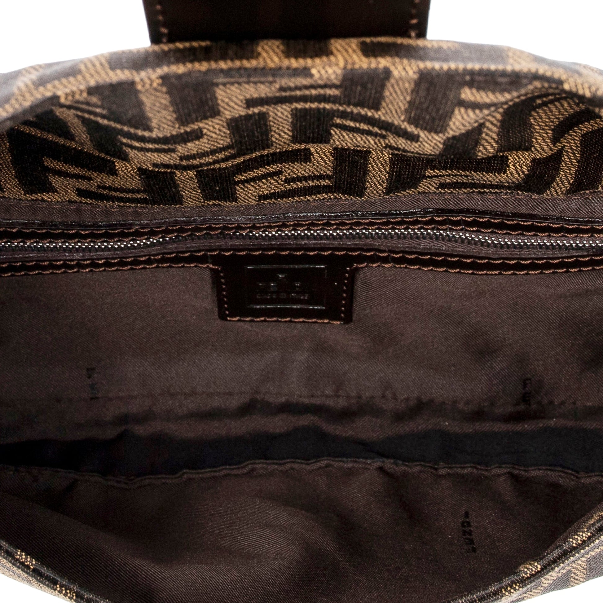 The Mamma baguette features a canvas body, a flat leather strap, a front flap with a flat leather strap and metal hardware, and an interior zip pocket.