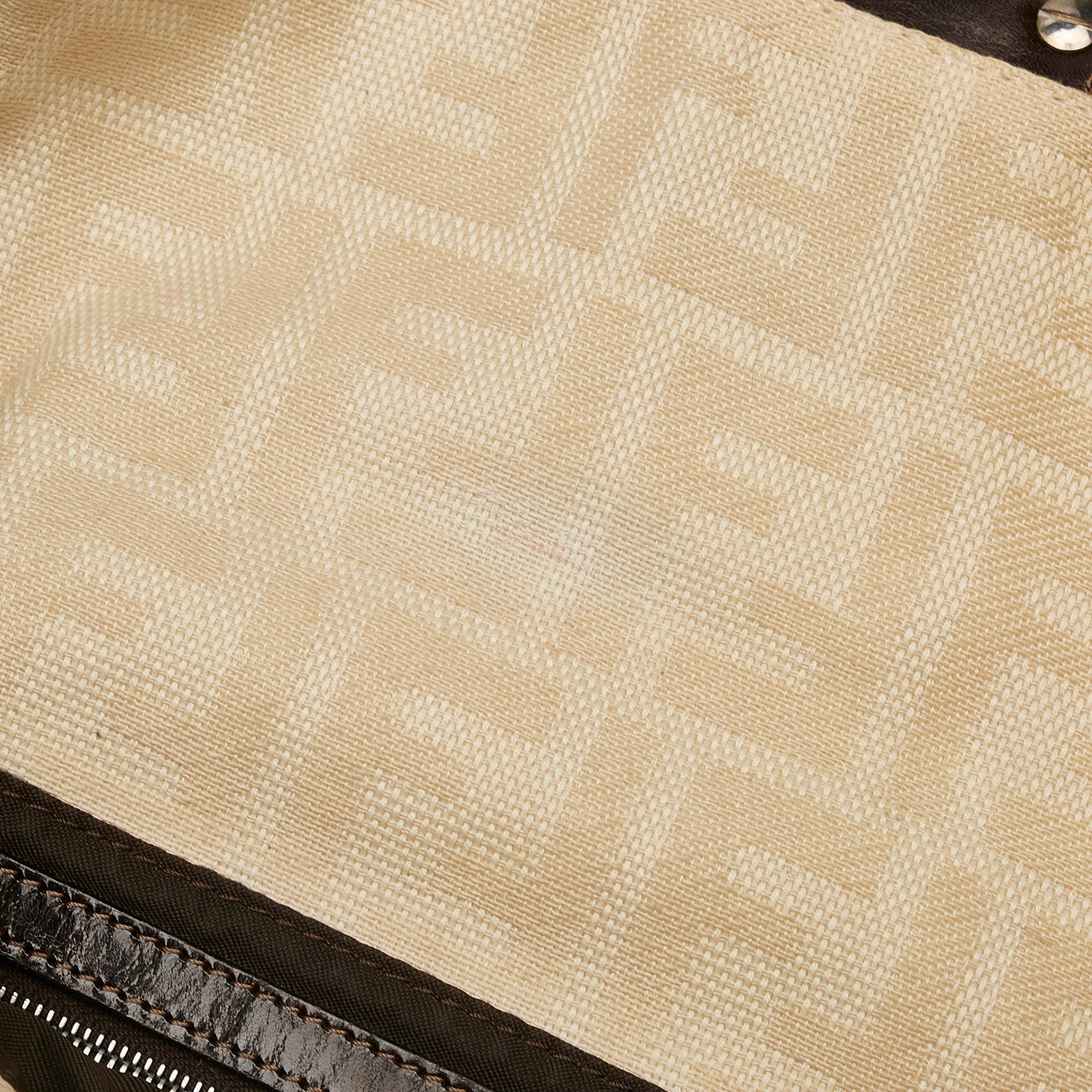 This baguette is crafted of patent canvas and features a flat leather shoulder strap, a magnetic snap closure, and an interior zip pocket that opens to a fabric interior, with enough space for your daily essentials.