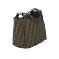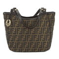 This is an pre owned Fendi Medium Chef Shopping Tote in the iconic Zucca monogram with dark brown leather trim. This bag features 2 open exterior pockets, 1 interior open pocket and a top zipper closure. Leather shoulder straps come adorned with a gold tone logo bag charm.