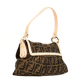 This is an , FENDI Small Zucca Tote Bag. It features the Zucca canvas with a pink leather trim, a flat handle, a detachable Fendi charm, and gold-tone hardware. The interior has a Fendi fabric lining with a flat pocket and a flap magnetic closure.