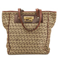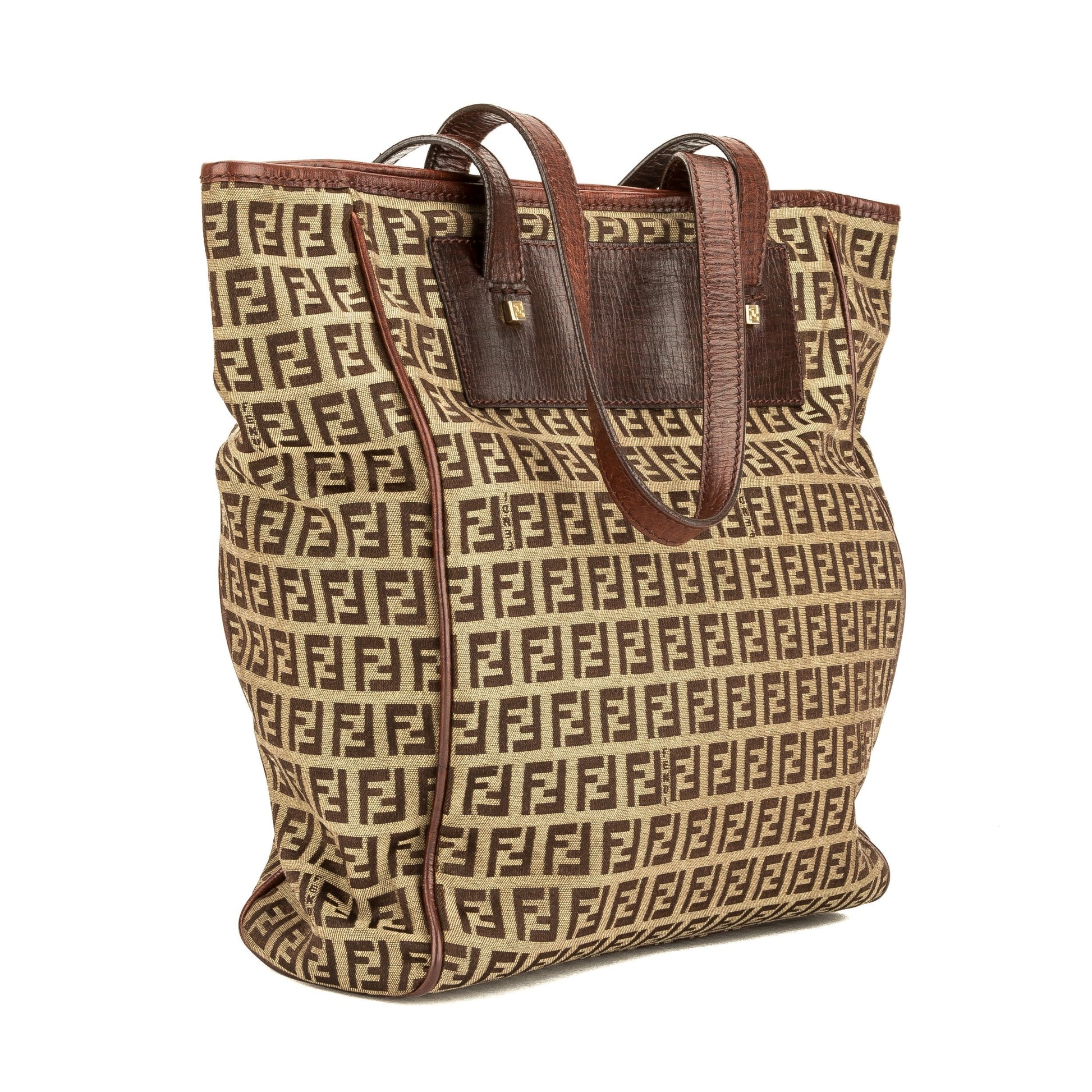 This is an , FENDI Tote Bag. This is a chic Fendi handbag for any occasion. It features the Fendi Zucca canvas with a brown leather trim, flat handles, and gold-tone hardware. The interior has a Fendi fabric lining with a snap pocket, space for necessities, and a Fendi metal tab closure. Made in Italy. This item is in good condition, it has scratches on the hardware, small discoloration on interior, hardly noticeable. See photos for details. Pay close attention to sizes and measurements.