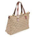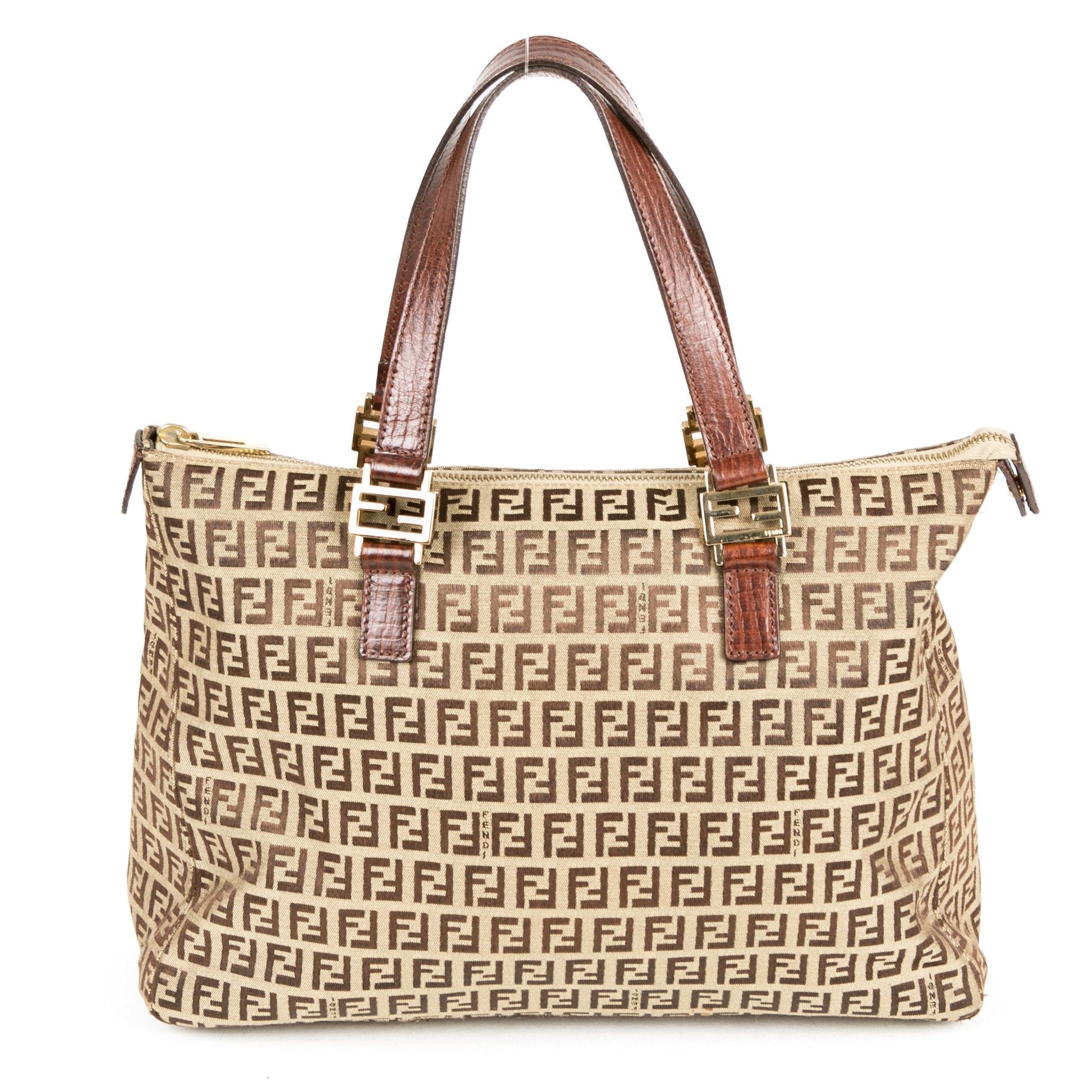This pre owned Fendi Zucchino Shopping Tote features the classic FF mono exterior with brown leather trimmings and nylon canvas Top zipper closure with the signature logo pull. This Fendi Shopping Tote Bag is a stylish tote bag with the Zucchino small Fendi logo fabric. This tote bag features dark brown Zucchino on beige fabric brown leather handles and trimming as well as gold-toned Fendi logo. A great tote were you can put all your belongings.: Pre Owned