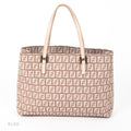 This  pre owned Fendi Zucca Tote features the classic FF mono exterior with pink leather trimmings one middle pocket with a zipper and gold tone hardware.
