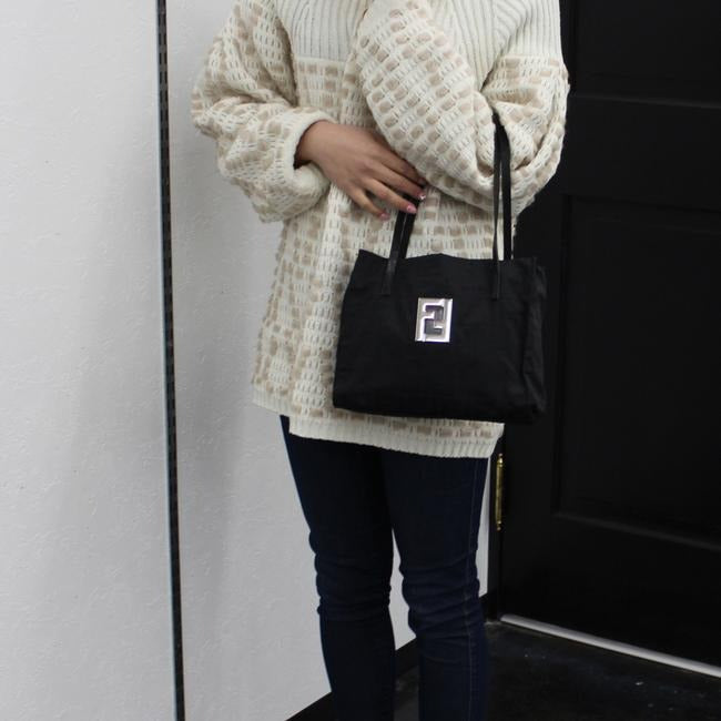 The bag is the perfect, square shaped, Fendi, medium satchel or tote that no one else will have! The purse looks smaller but is a larger size based on all it can hold! It is made of black large F logo print or Zucco print canvas and black leather. It has two leather straps as handles that can be adjusted and chrome hardware!