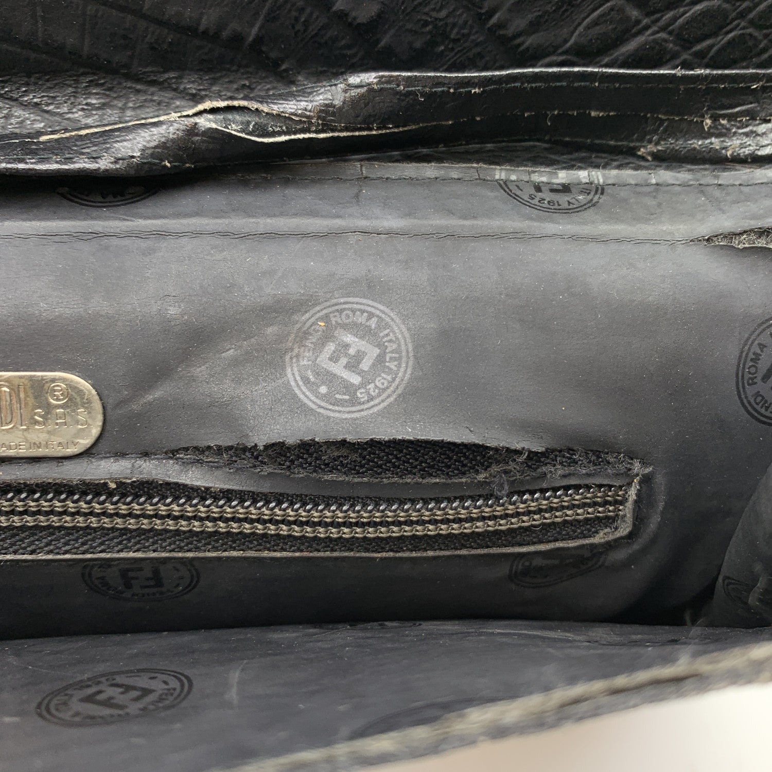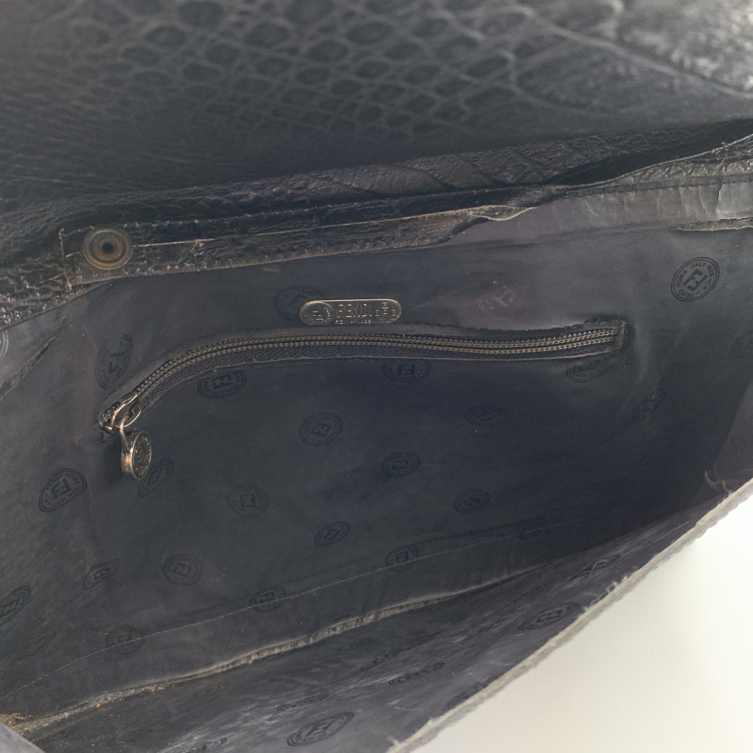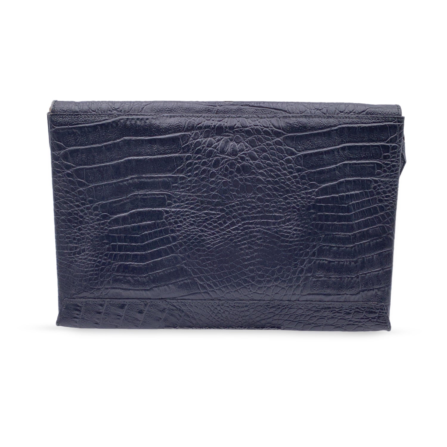 Vintage Fendi Porfolio/clutch Bag From The 80s. Crafted In Black Leather With Embossd Crocodile Look. Flap With Magnetic Button Closure. Ff - Fendi Logo On The Front, Signature Fabric Lining. 1 Side Zip Pocket Inside. Removable Shoulder Strap. 'Fendi s.a.s. Roma - Made In Italy' Tag Inside.