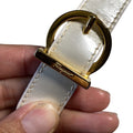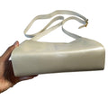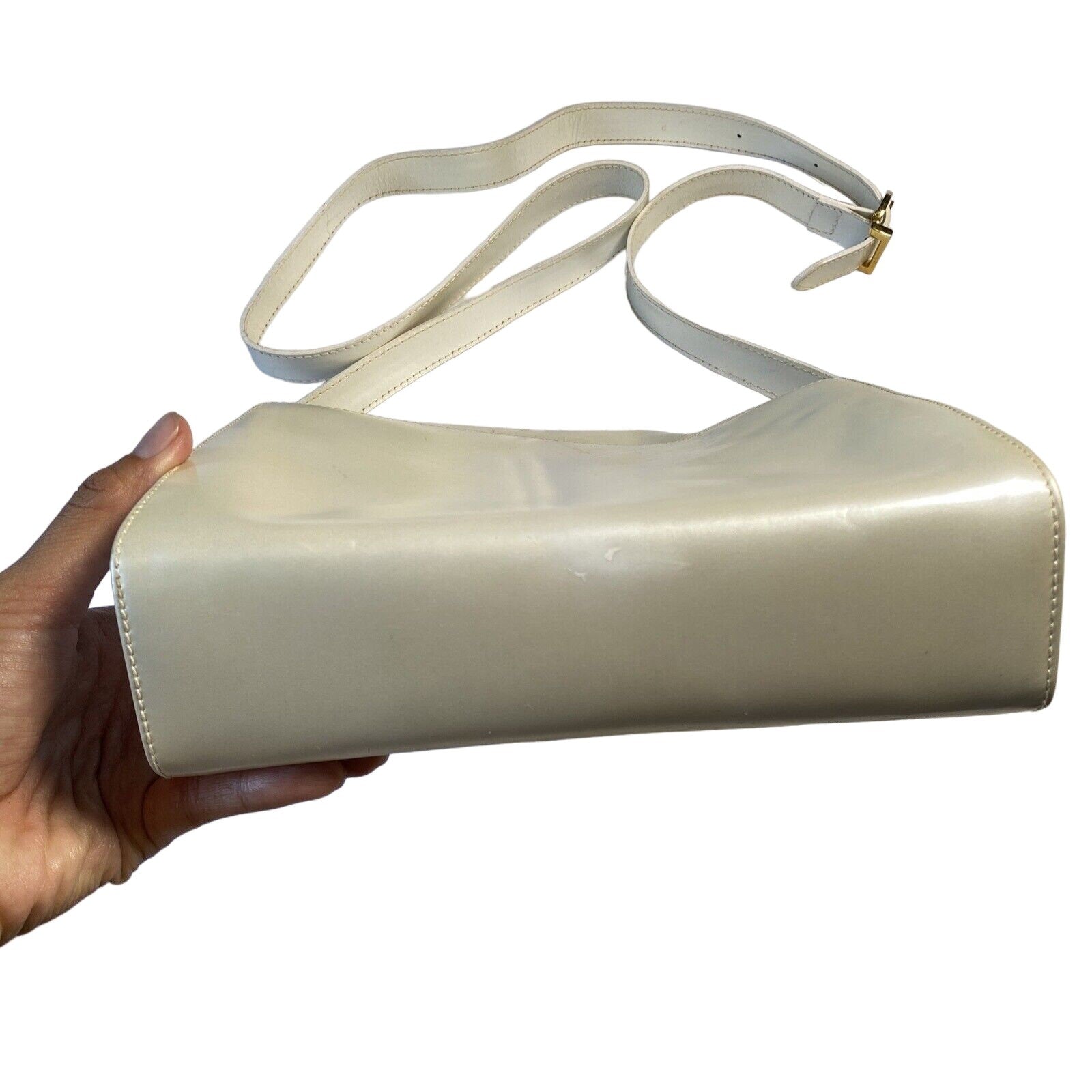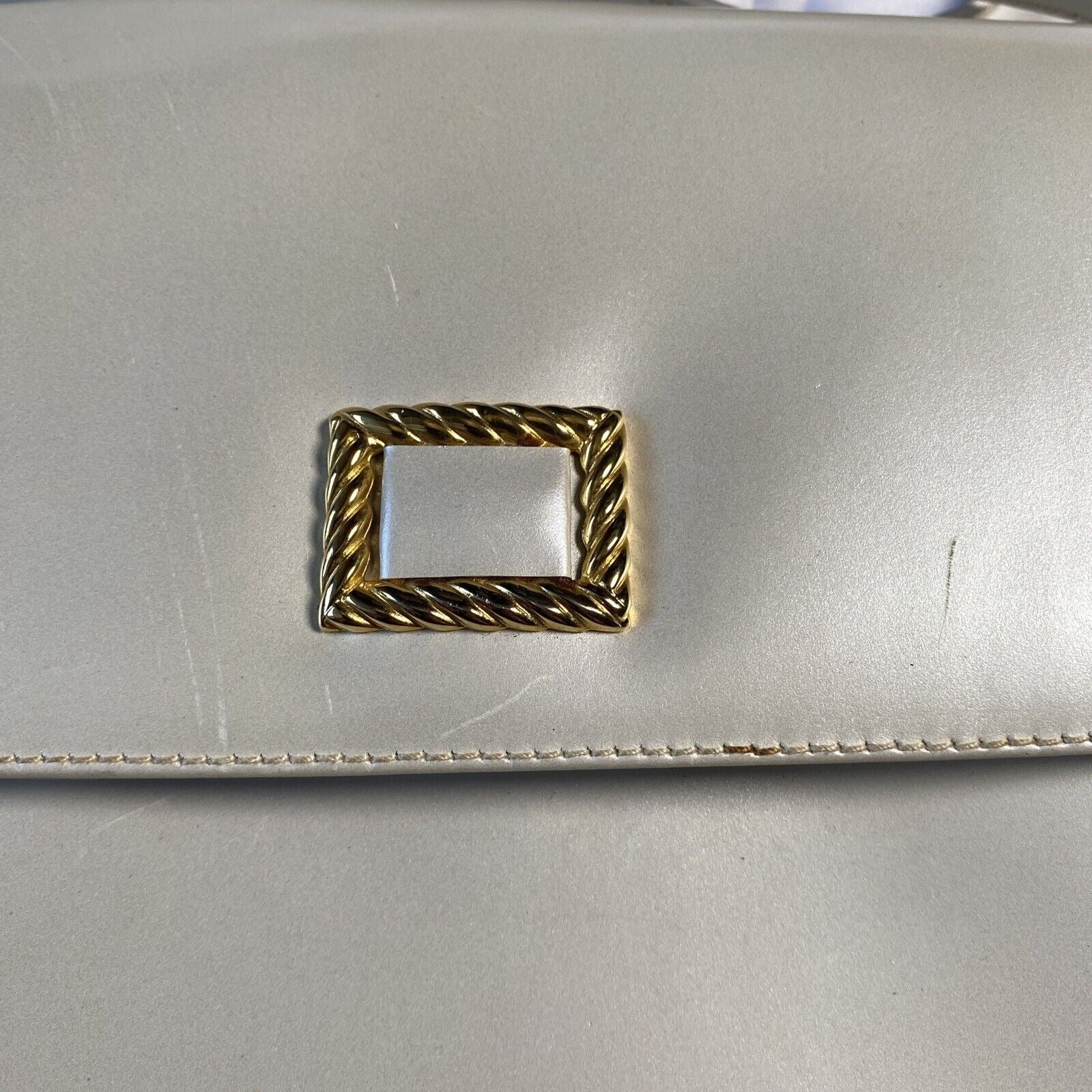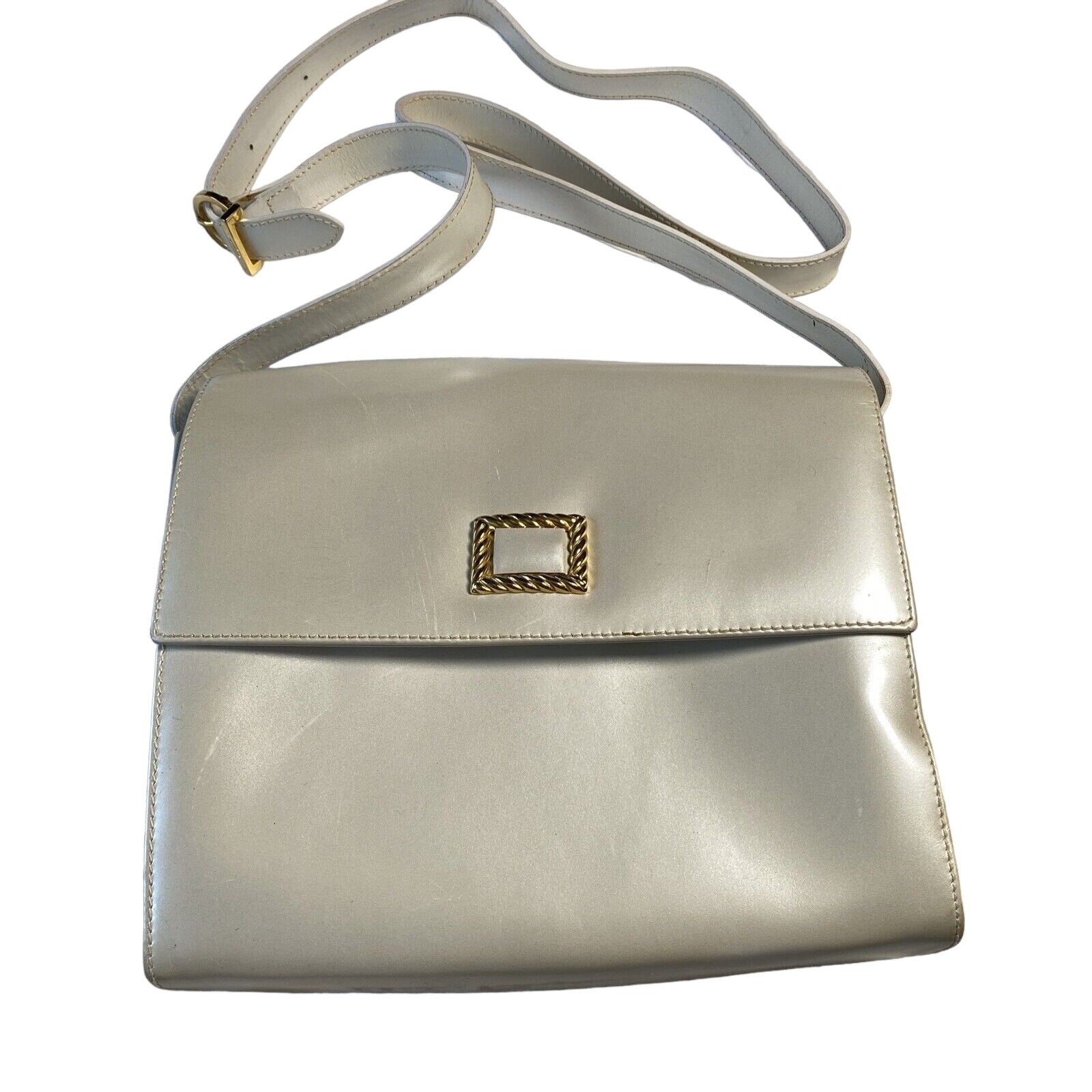 It is made by Italian designer Salvatore Ferragamo in an iridescent, pearly metallic, light pewter leather with a gold accent on the front and a 'Gancini' accent as the buckle for the strap. This bag is so cool and screams late 60's mod, but is still modern and edgy! It has an adjustable strap, so it can be used as a shoulder bag or carried as a cross body style. It is made from a buttery soft, glossy, metallic, pewter leather and has gold tone hardware.