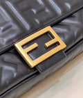 Iconic medium Baguette bag made of black soft nappa with a three-dimtlmsional texture FF motif. The bag can be carried by hand, or worn either on the shoulder or cross-body thanks to the handle and shoulder strap, both detachable.