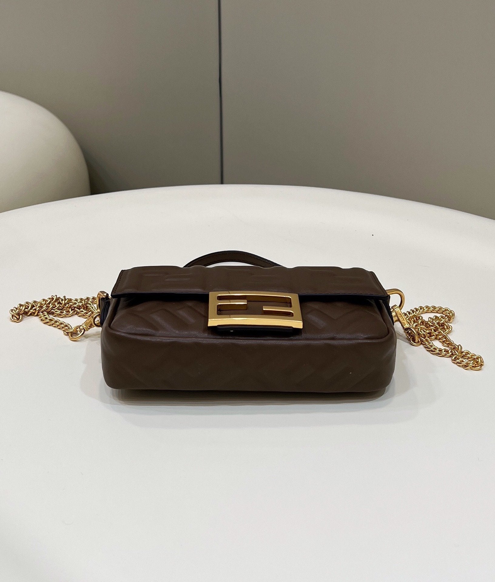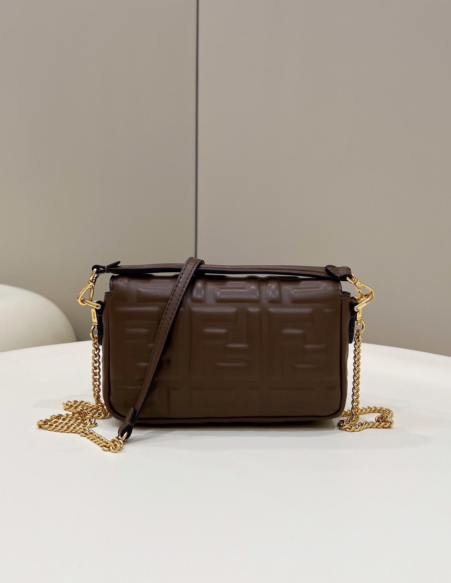 Iconic mini Baguette bag, made of soft brown-coloured nappa with an embossed FF motif and decorated with an FF clasp. The bag can be carried by hand, or worn either on the shoulder or cross-body thanks to the handle and shoulder strap, both detachable.