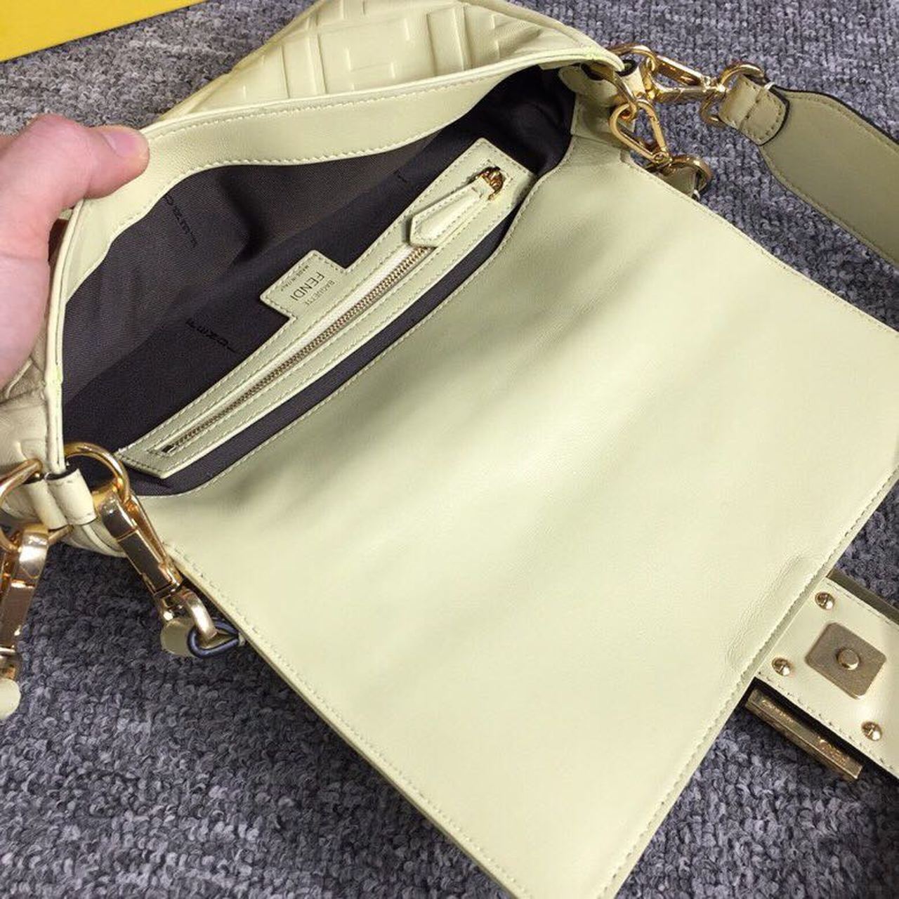 Iconic medium Baguette bag made of cream soft nappa with a three-dimensional texture FF motif. Decorated with an FF clasp. The bag can be carried by hand, or worn either on the shoulder or cross-body thanks to the handle and shoulder strap, both detachable.