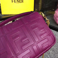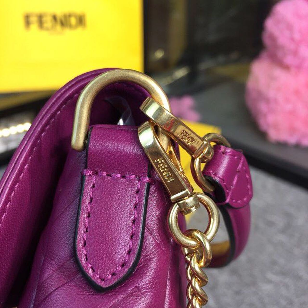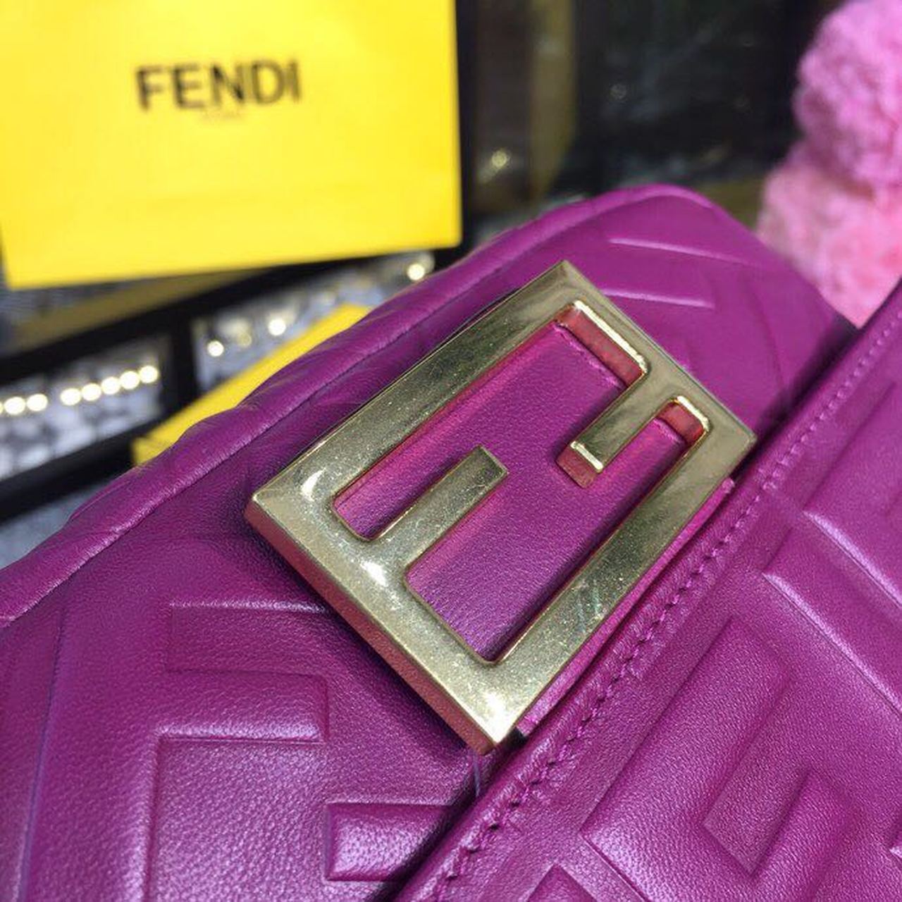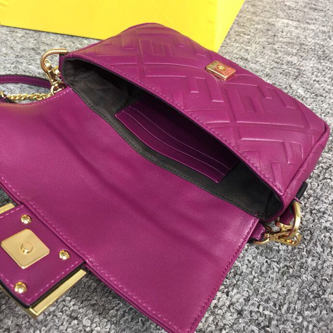 Iconic small Baguette bag made of purple soft with a three-dimensional texture FF motif. Decorated with an FF clasp. The bag can be carried by hand, or worn either on the shoulder or cross-body thanks to the handle and chain shoulder strap, both detachable.