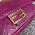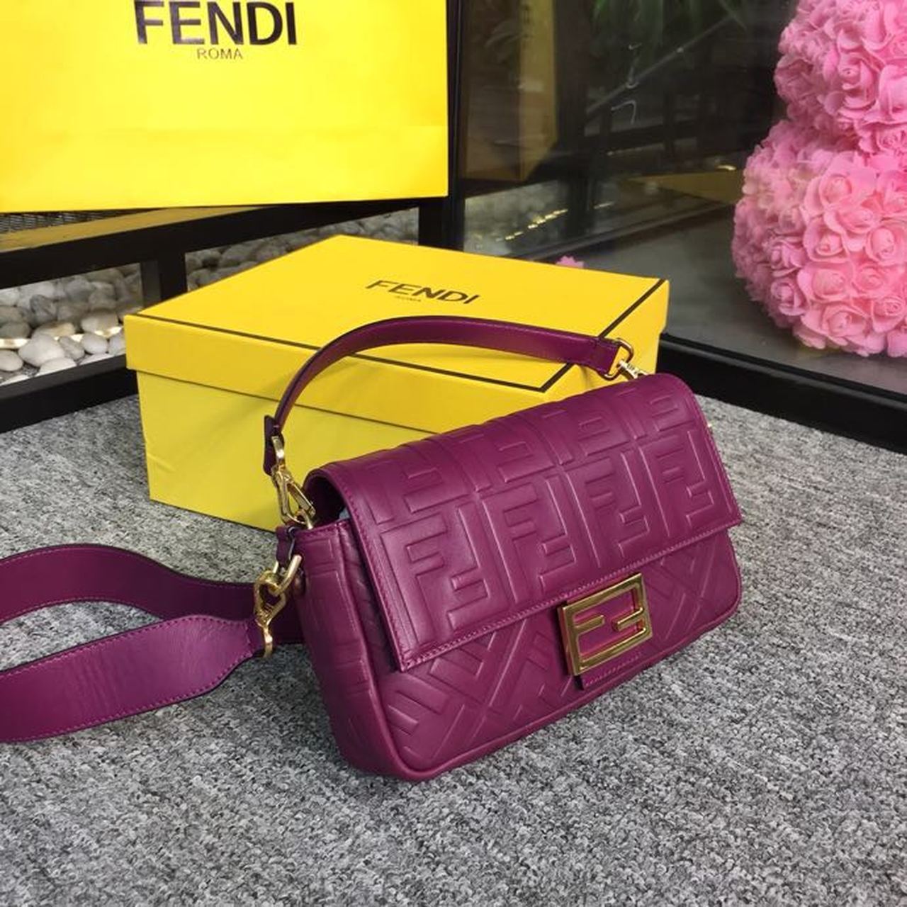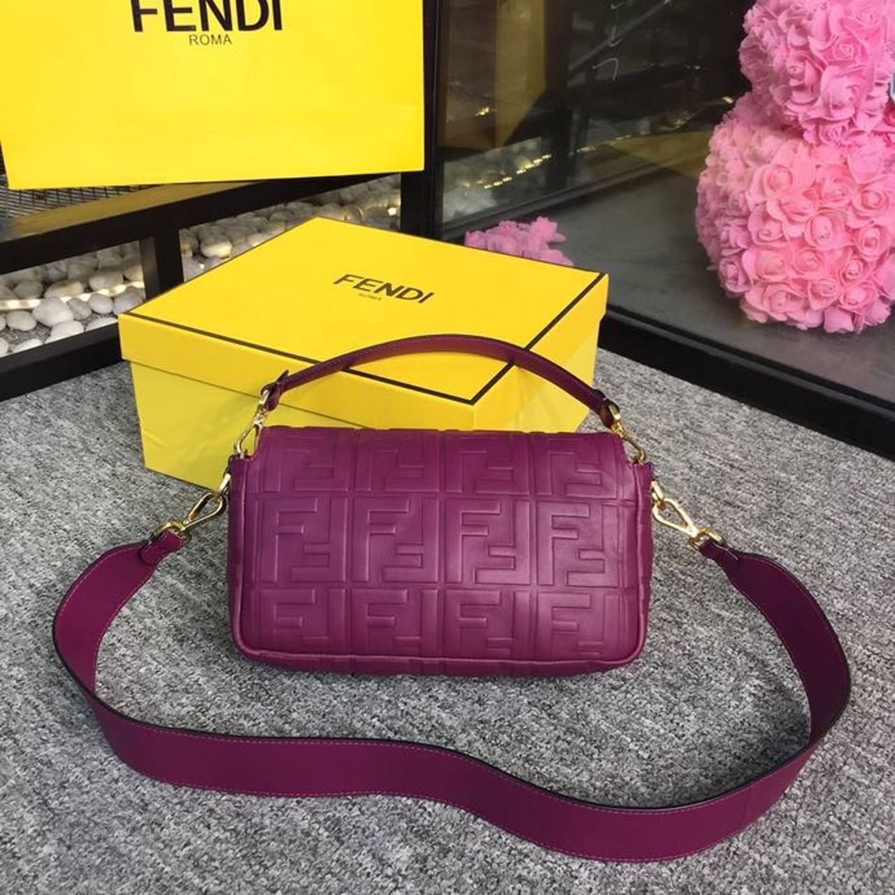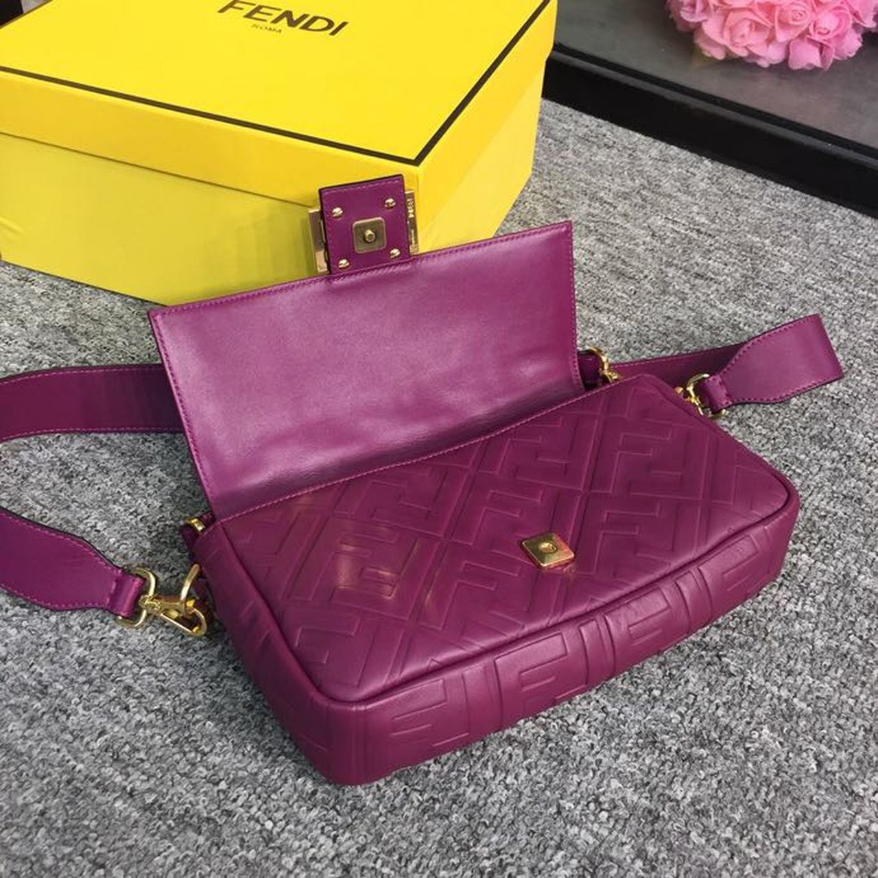 Iconic medium Baguette bag made of purple soft nappa with a three-dimtlmsional texture FF motif. Decorated with an FF clasp. The bag can be carried by hand, or worn either on the shoulder or cross-body thanks to the handle and shoulder strap, both detachable.