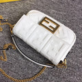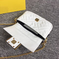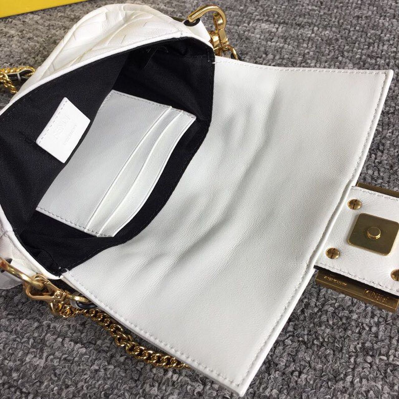 Iconic mini Baguette bag made of white soft nappa with a three-dimensional texture FF motif. Decorated with an FF clasp. The bag can be carried by hand, or worn either on the shoulder or cross-body thanks to the handle and chain shoulder strap, both detachable.