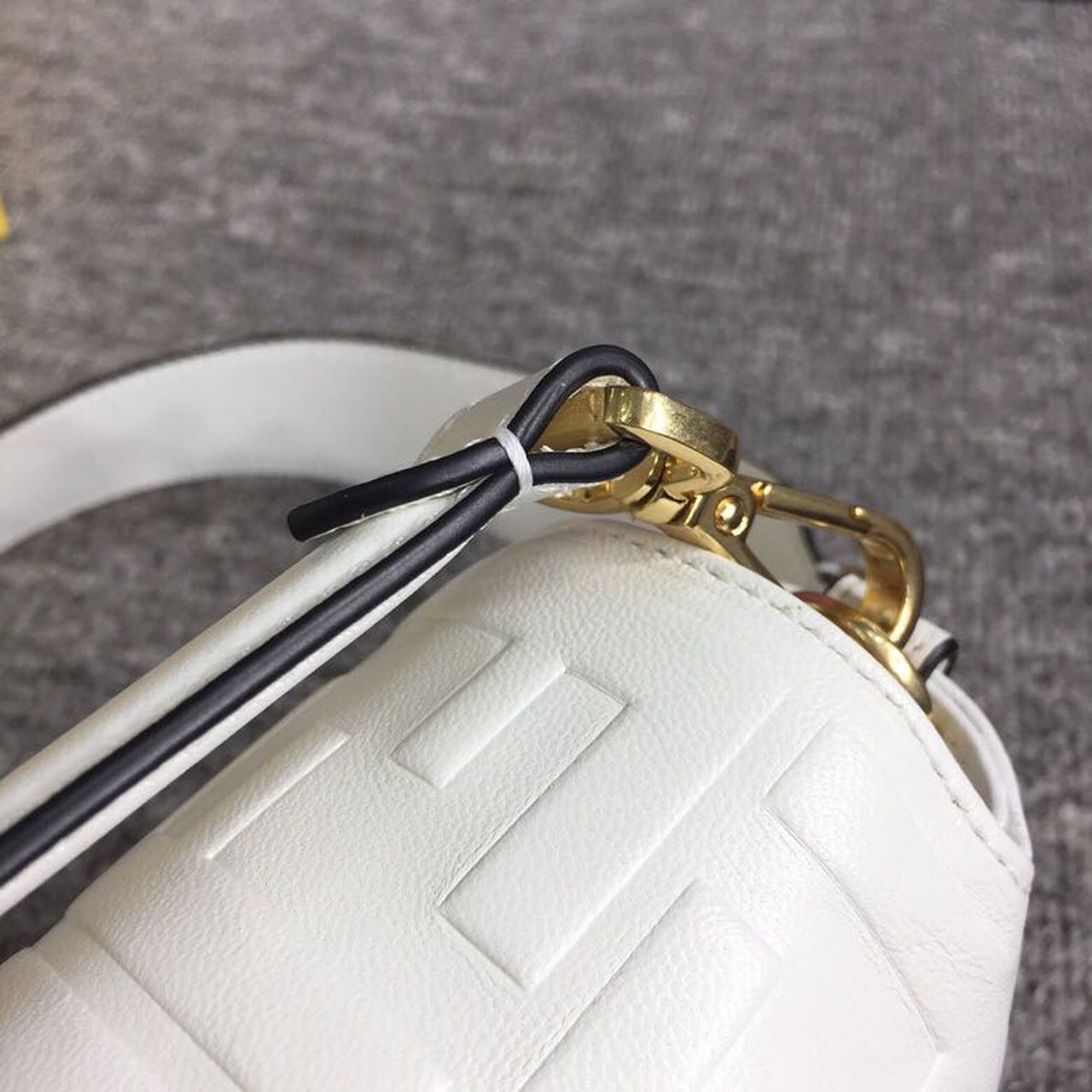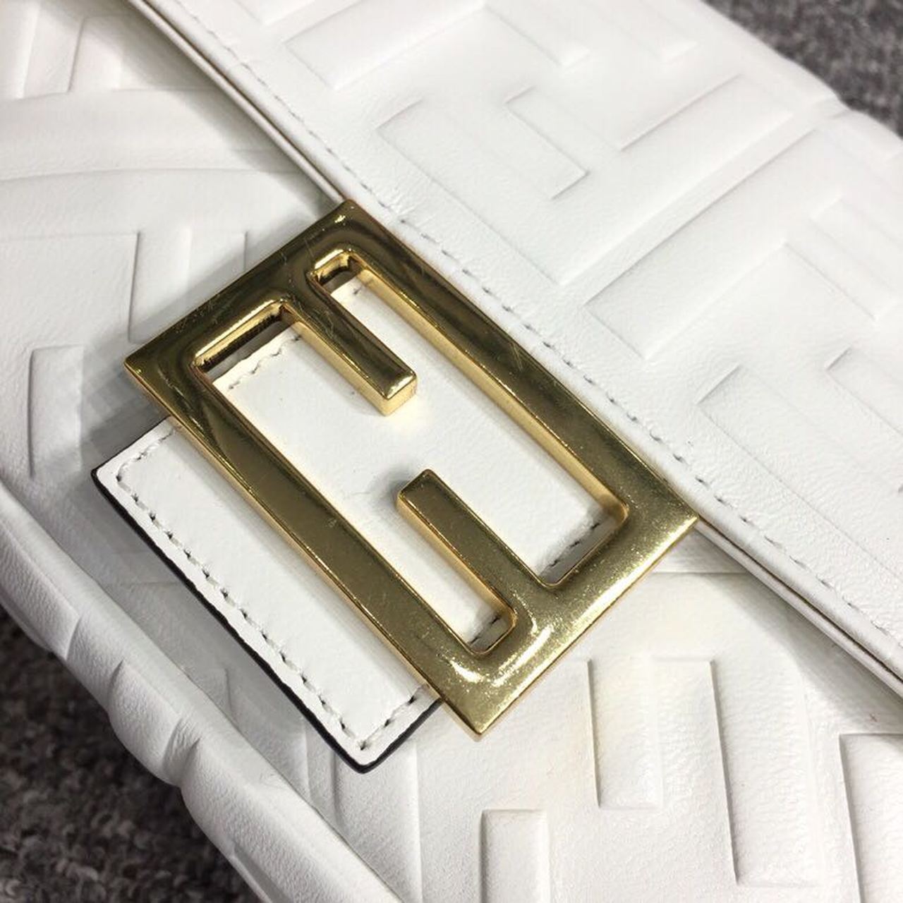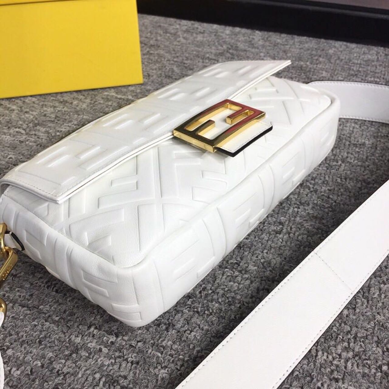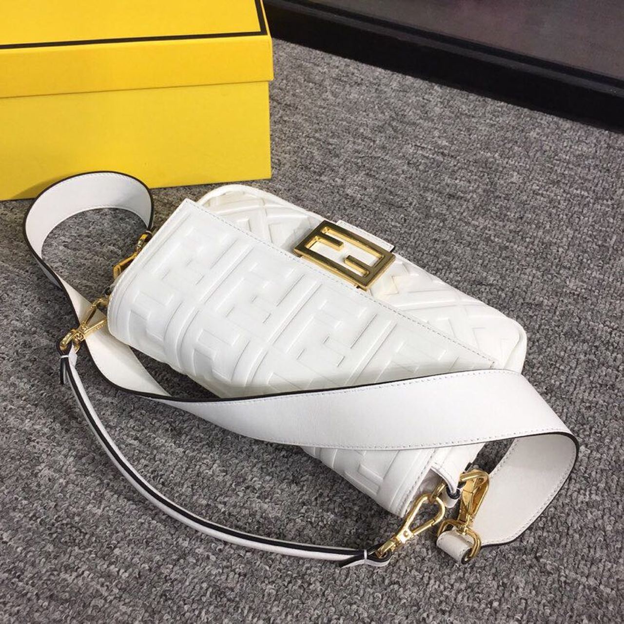 Iconic medium Baguette bag made of white soft nappa with a three-dimtlmsional texture FF motif. The bag can be carried by hand, or worn either on the shoulder or cross-body thanks to the handle and shoulder strap, both detachable.