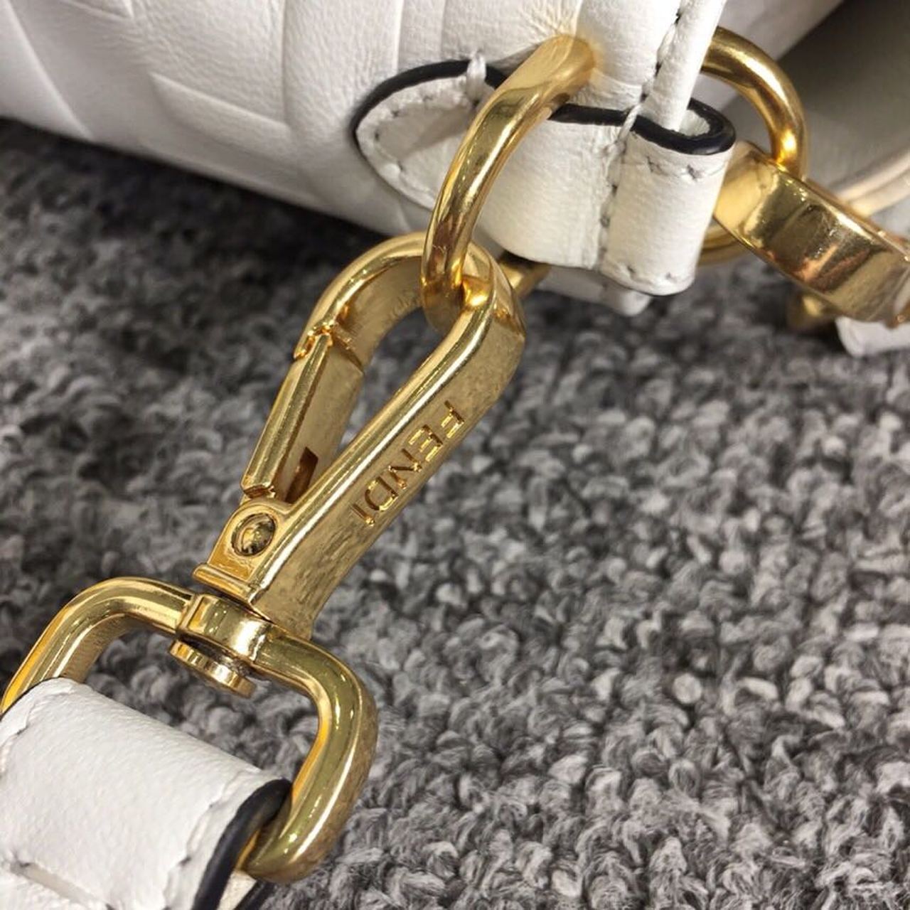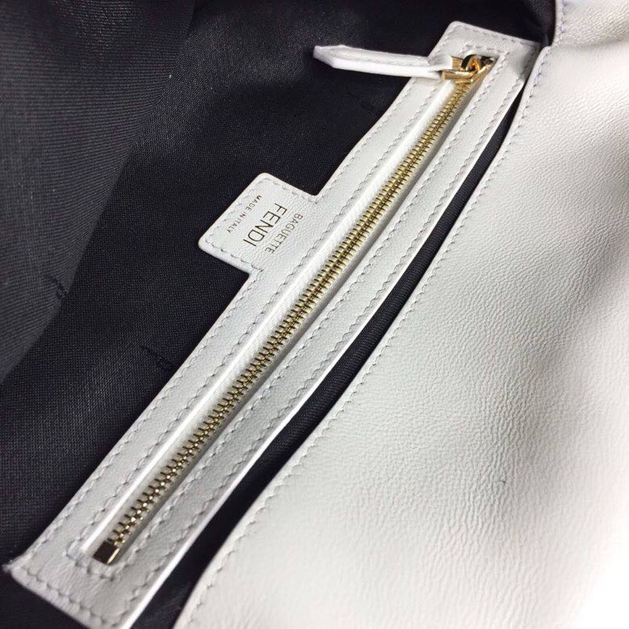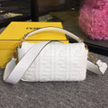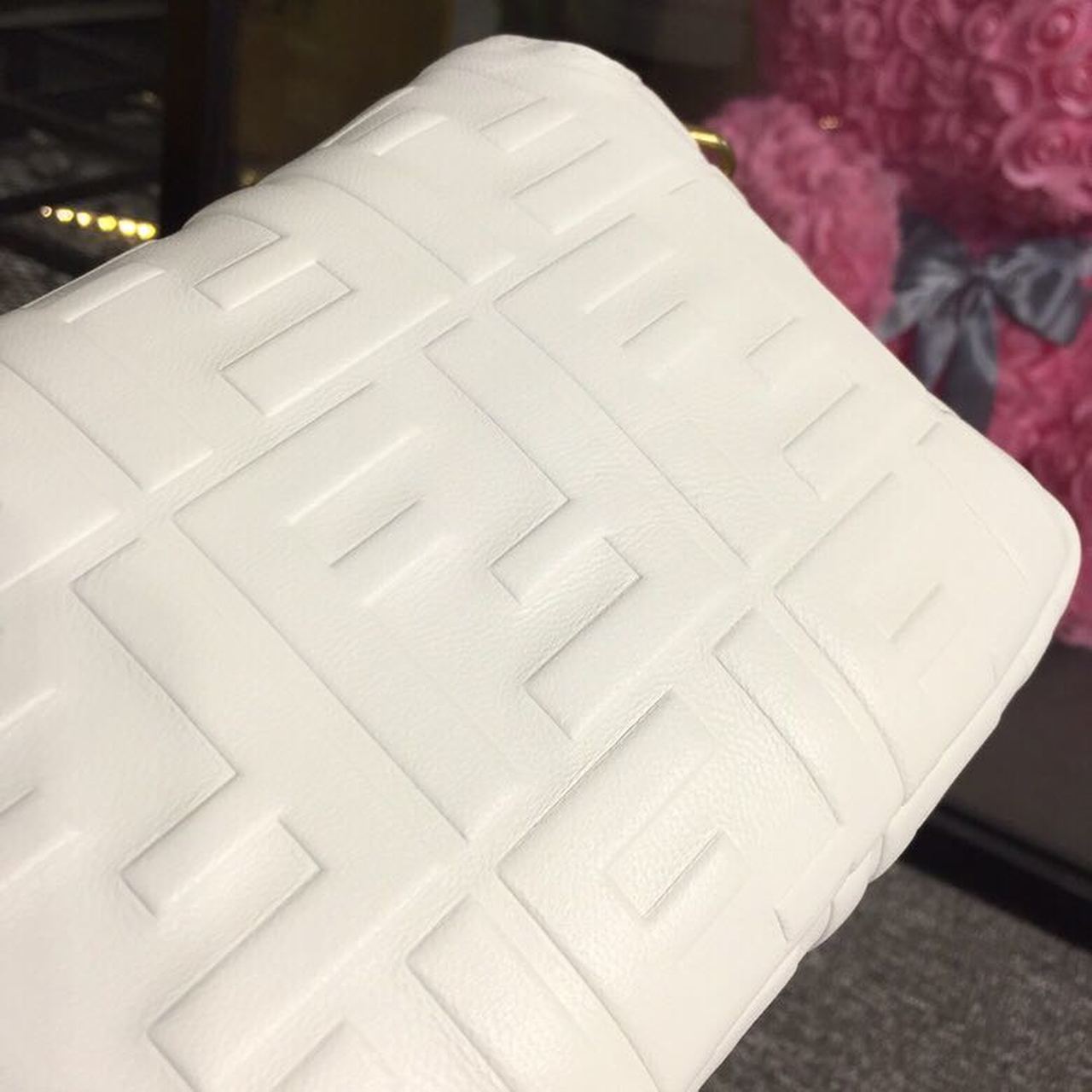 Iconic medium Baguette bag made of white soft nappa with a three-dimtlmsional texture FF motif. The bag can be carried by hand, or worn either on the shoulder or cross-body thanks to the handle and shoulder strap, both detachable.