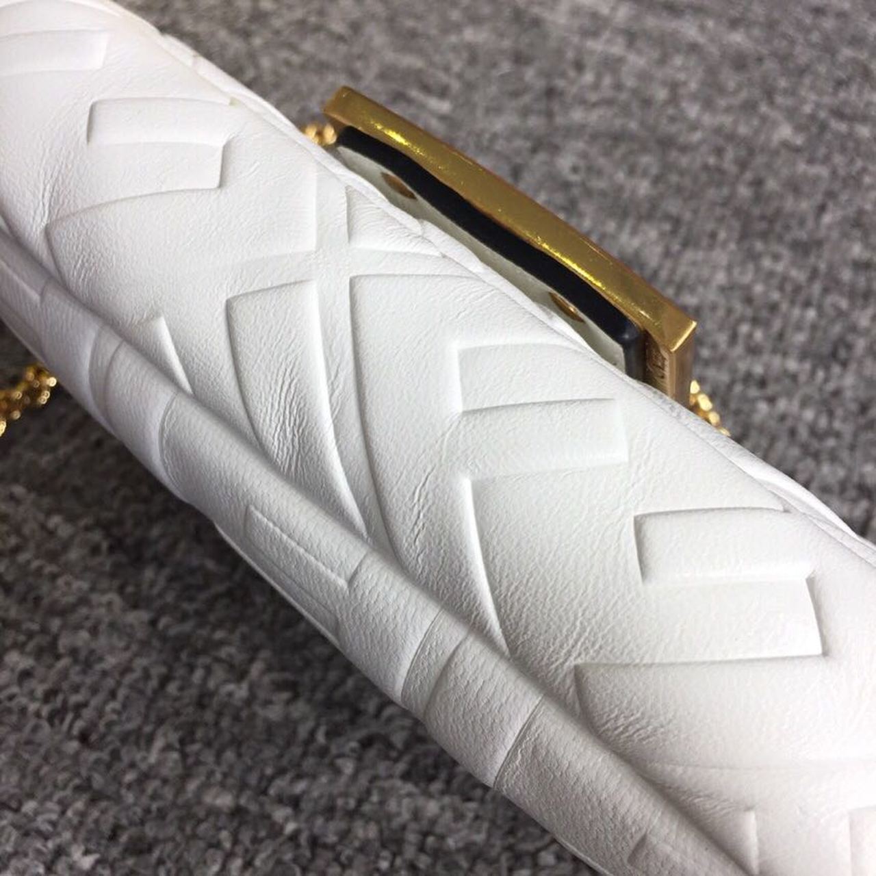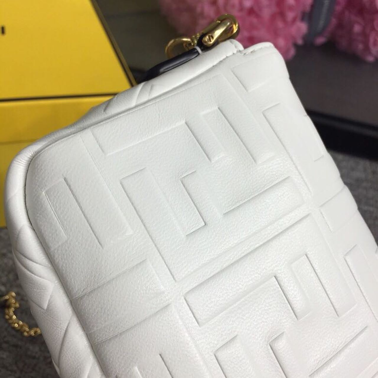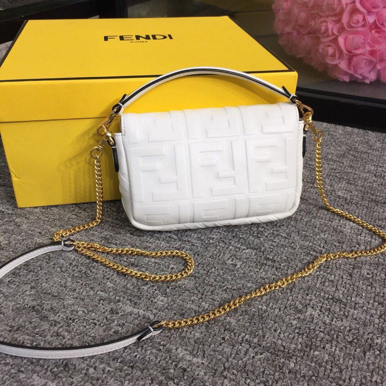 Iconic mini Baguette bag made of white soft nappa with a three-dimtlmsional texture FF motif. Decorated with an FF clasp. The bag can be carried by hand, or worn either on the shoulder or cross-body thanks to the handle and chain shoulder strap, both detachable.