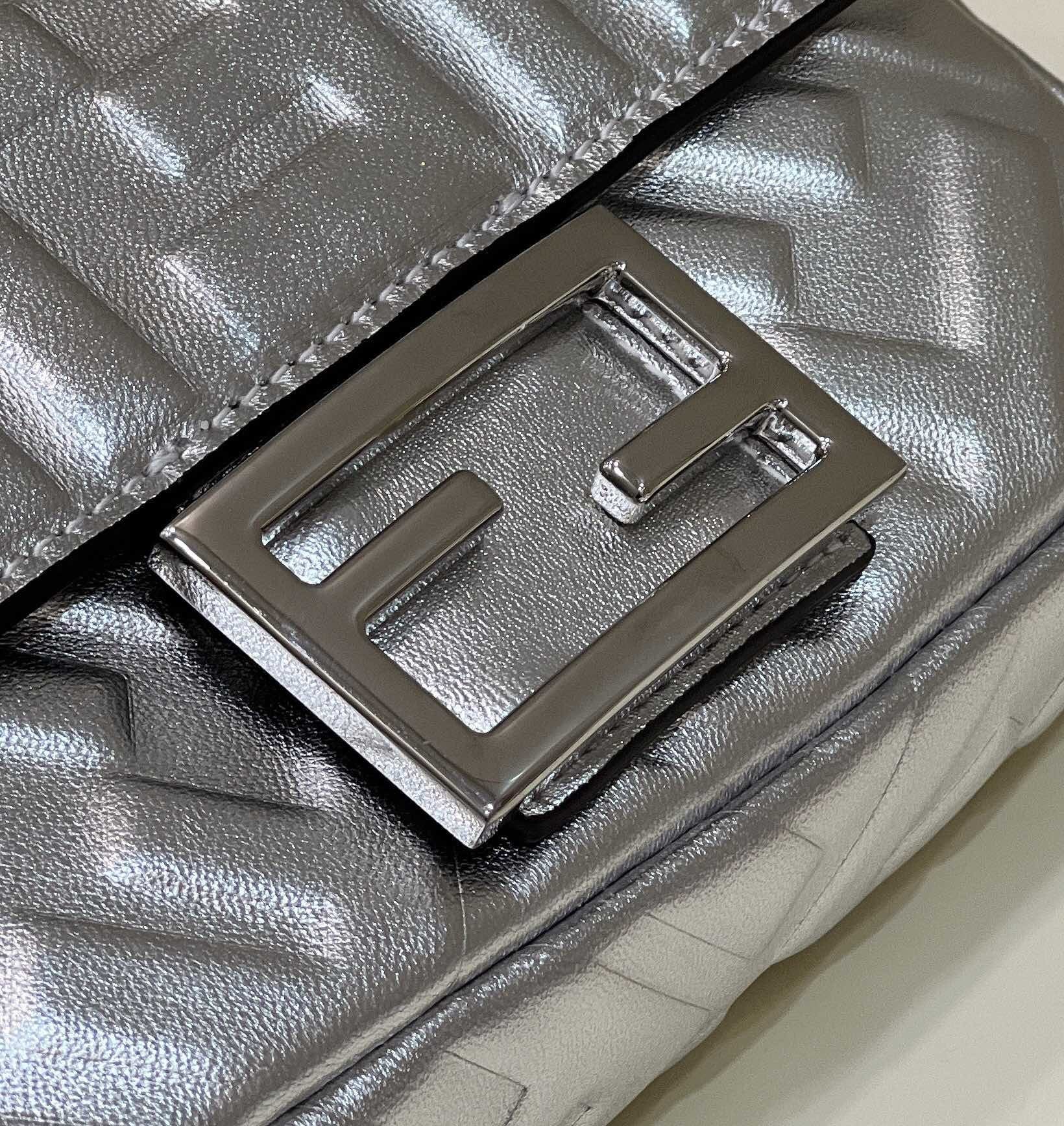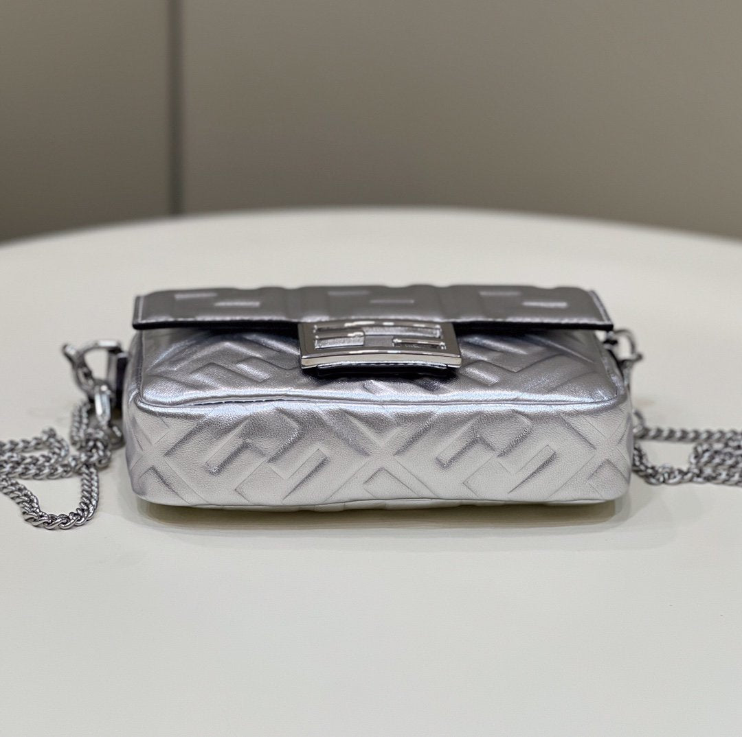 Iconic mini Baguette bag, made of soft silver-coloured nappa with an embossed FF motif and decorated with an FF clasp. The bag can be carried by hand, or worn either on the shoulder or cross-body thanks to the handle and shoulder strap, both detachable.