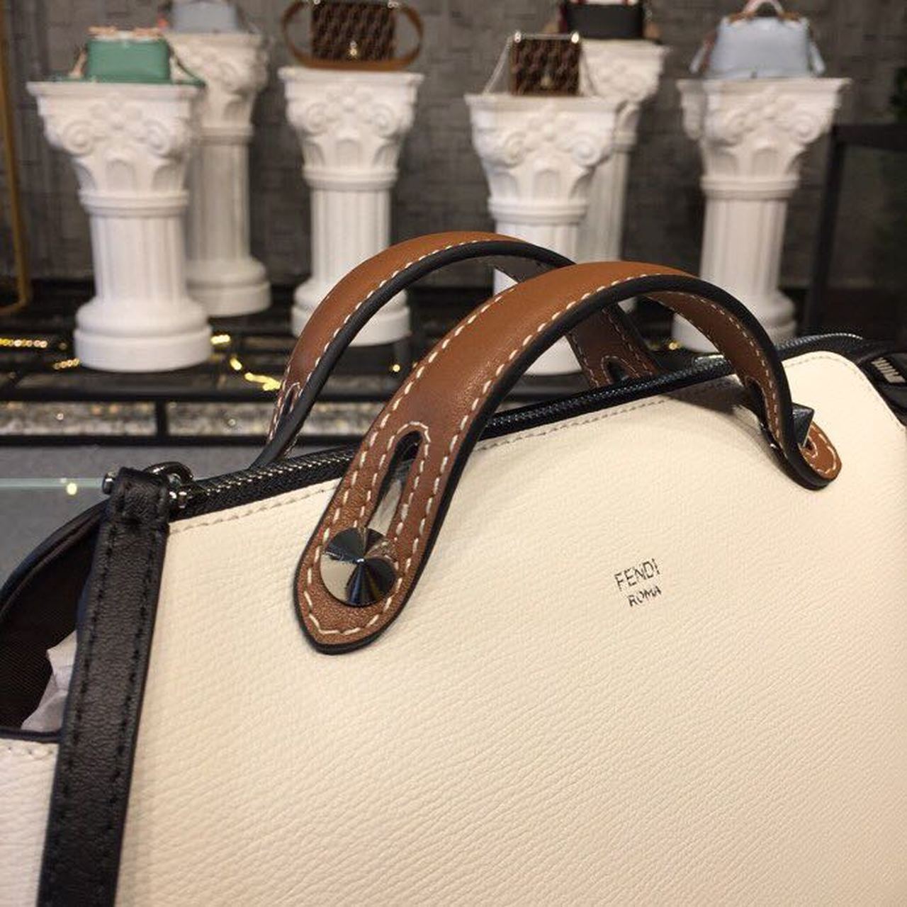 Iconic medium By The Way Boston bag made of white, with a zip fasttlming. The bag can be carried by hand with the handles with an embossed, hand-painted FF motif, or worn either on the shoulder or cross-body with the adjustable, detachable shoulder strap. Customisable ptlmdant with FF motif.