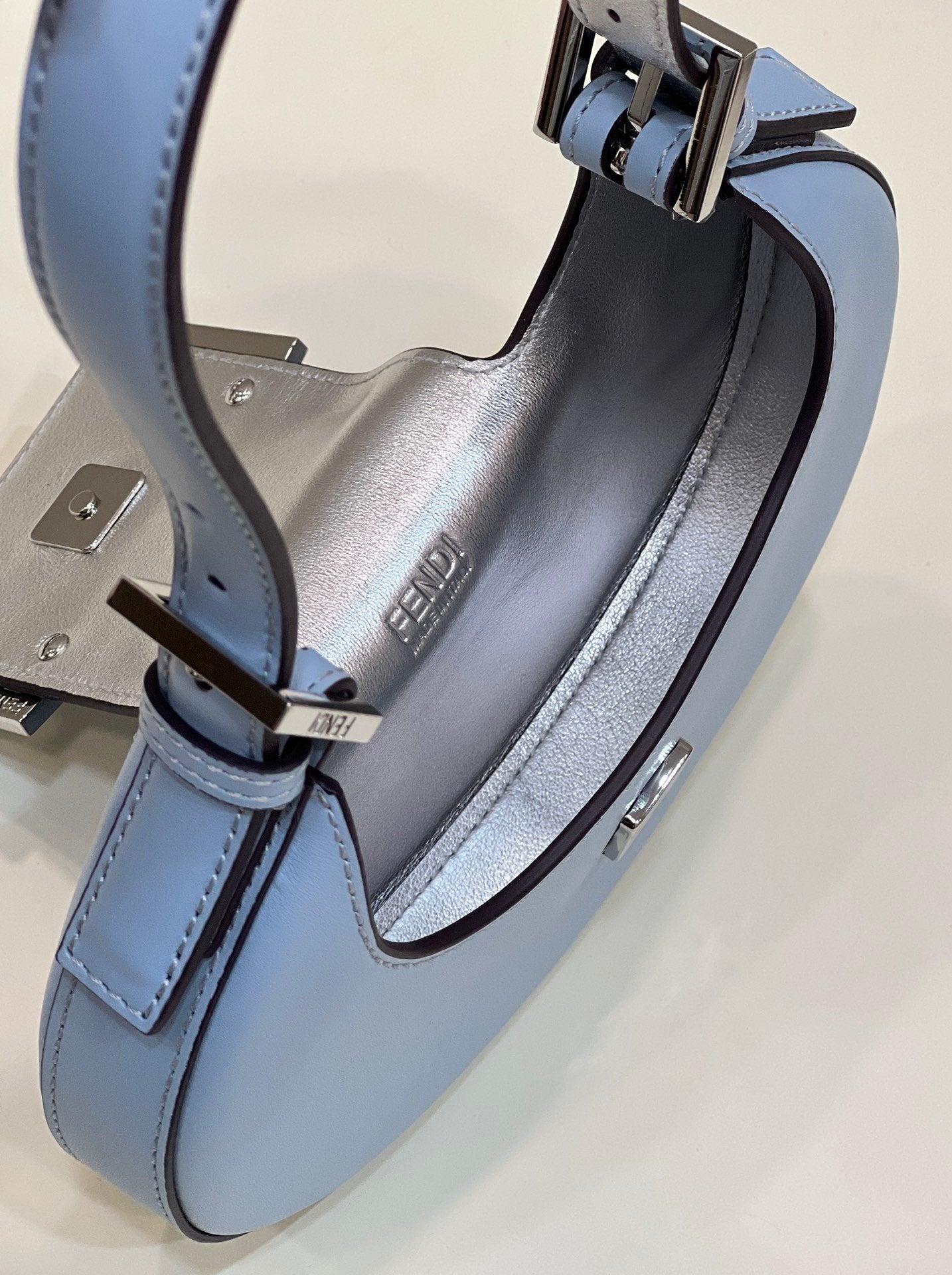 FND Cookie mini hobo bag made of pale blue decorated with an FF clasp. The bag can be carried by hand thanks to the adjustable strap.