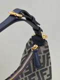 Small hobo bag made of soft brown, with vintage gold metal FND lettering visible when the bag is worn under the arm. Can be worn under the arm or cross-body thanks to the adjustable, detachable handle and the hooks that allow a shoulder strap to be attached.