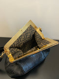 Small FND First bag made of exquisite, black python. Decorated with an F-shaped snap clasp covered in tone on tone python. The bag can be carried by hand as a clutch, or worn on the shoulder thanks to the adjustable, detachable python shoulder strap.