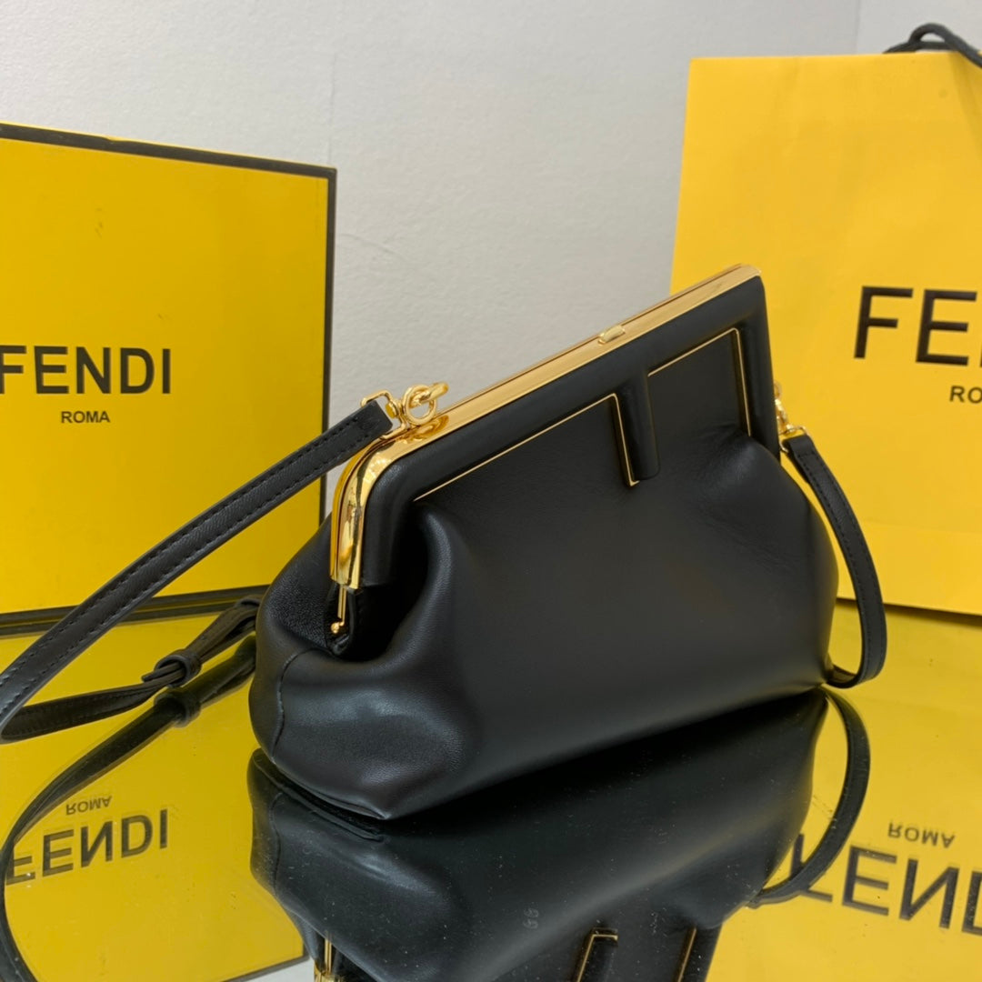 Small FND First bag made of soft, black nappa with oversized metal F clasp with tone on tone nappa bands. Can be carried by hand as a clutch or worn on the shoulder thanks to the detachable shoulder strap.