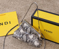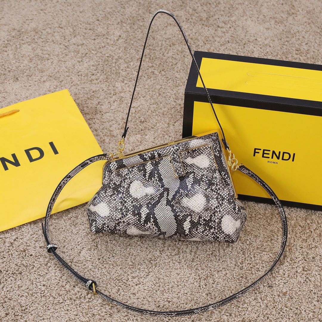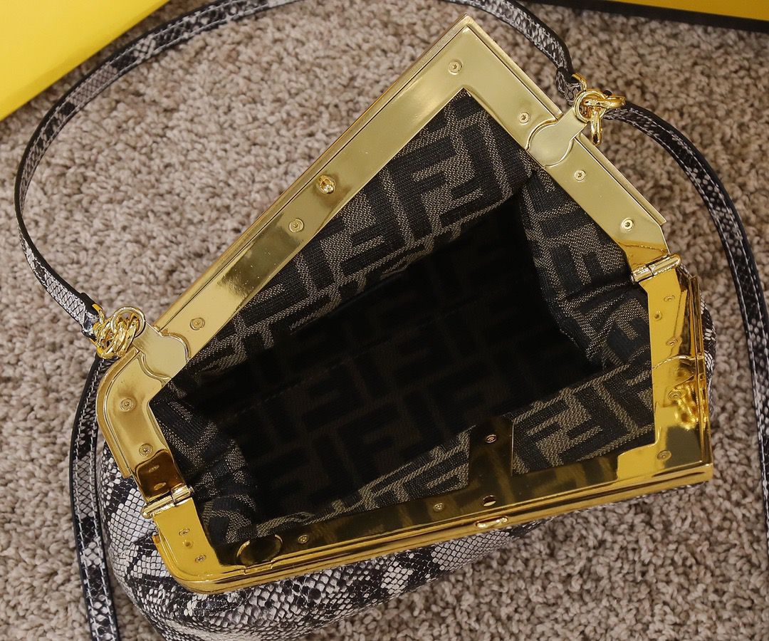 Small FND First bag made of exquisite natural-coloured python. Decorated with an F-shaped snap clasp covered in tone on tone python. The bag can be carried by hand as a clutch, or worn on the shoulder thanks to the adjustable, detachable python shoulder strap.