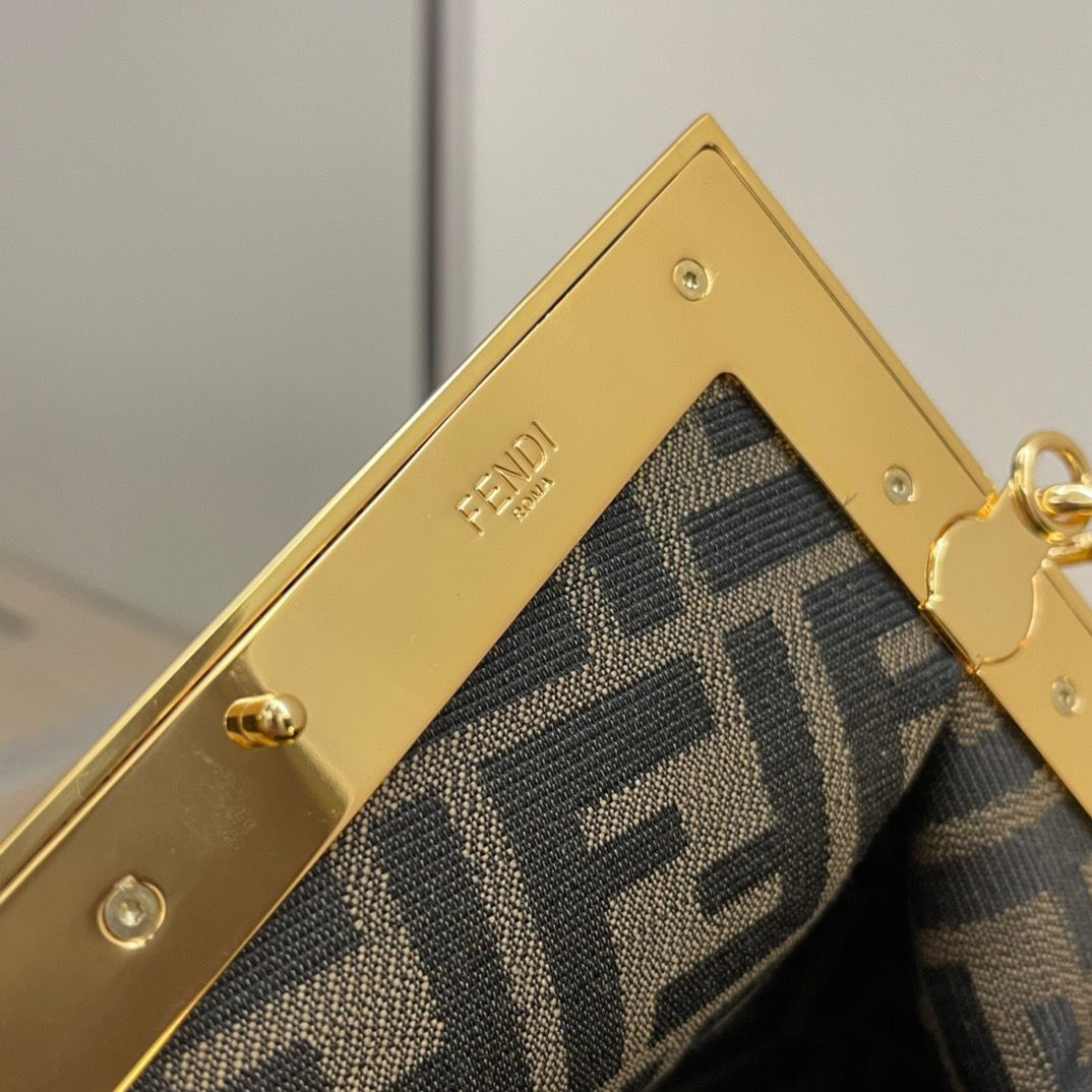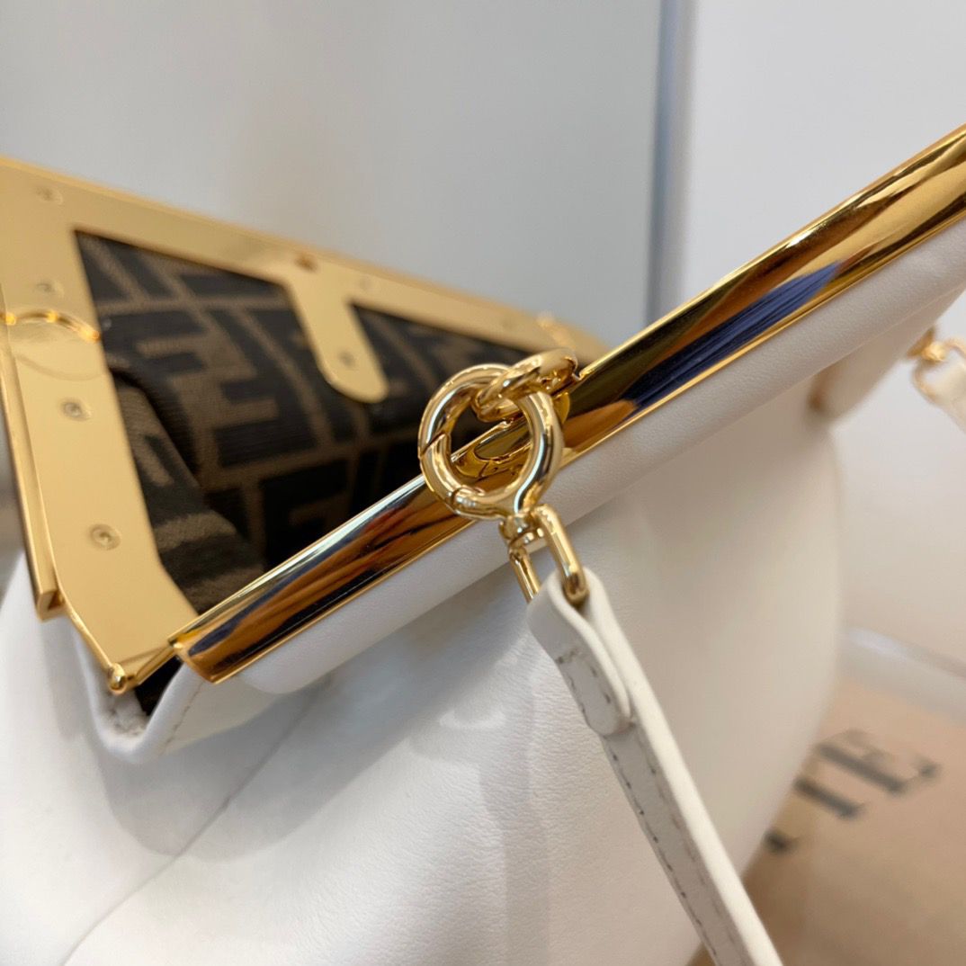 Small FND First bag made of soft, white nappa with oversized metal F clasp with tone on tone nappa bands. Can be carried by hand as a clutch or worn on the shoulder thanks to the detachable shoulder strap.