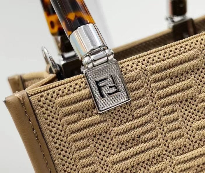 Mini Sunshine Shopper bag made of beige technical mesh with 3D texture FF motif and stiff tortoiseshell plexiglass effect handles. Can be carried by hand or worn on the shoulder thanks to the two handles and detachable shoulder strap.