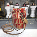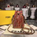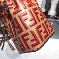 Small Mon Tresor bucket bag with drawstring fasttlming and metal decorations in the FND logo shape. Two detachable shoulder straps, one long and one short, to carry the bag in the hand, over the shoulder or cross-body. Iconic FF pattern printed in relief and hand-painted in red.
