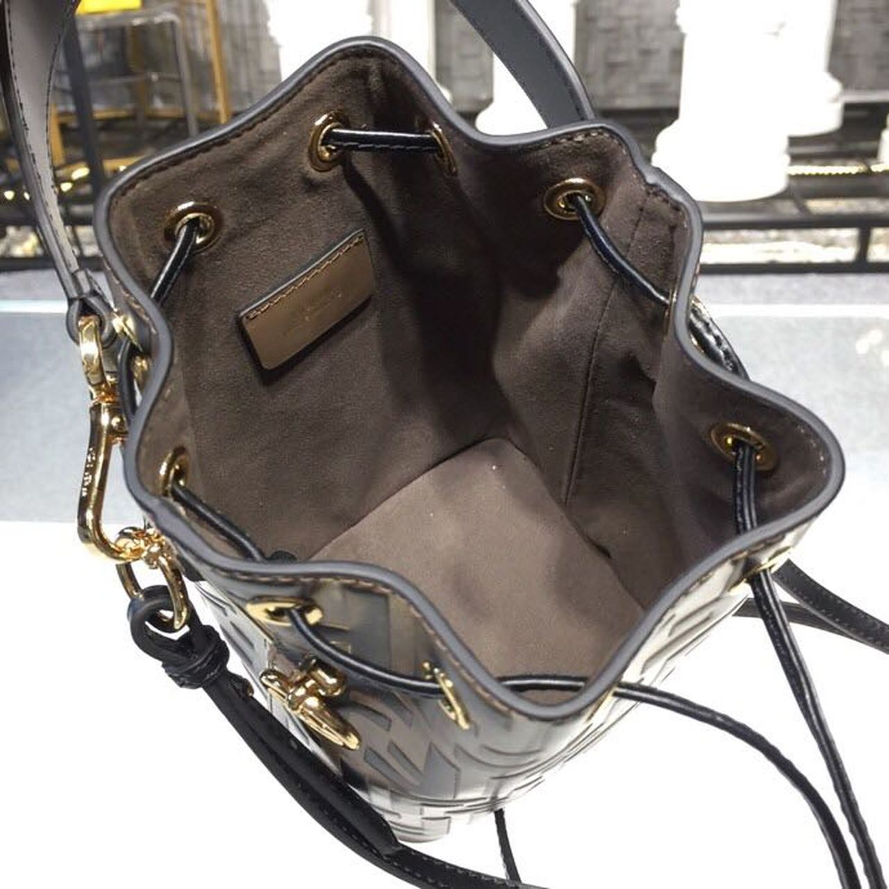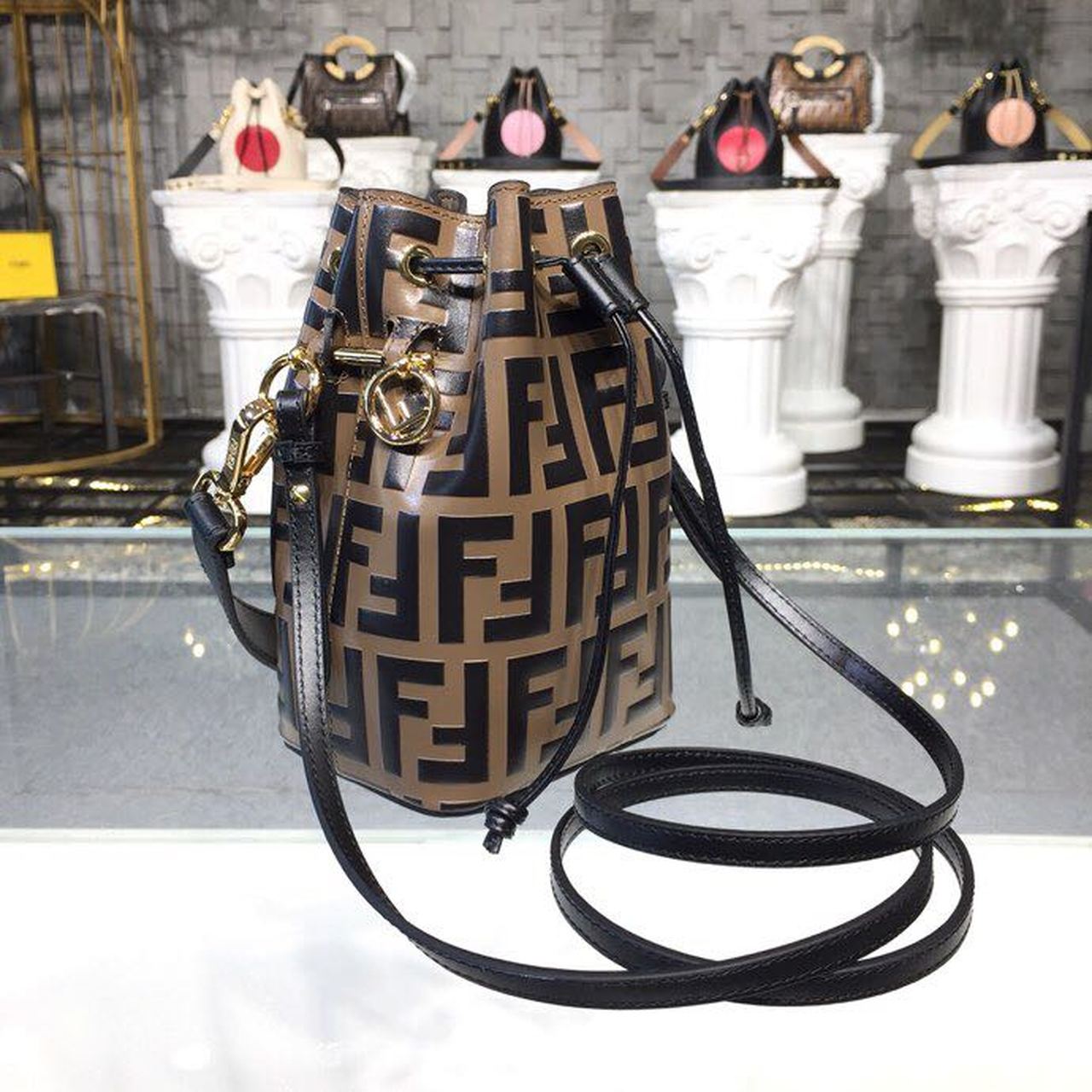 Small Mon Tresor bucket bag with drawstring fasttlming and metal decorations in the FND logo shape. Two detachable shoulder straps, one long and one short, to carry the bag in the hand, over the shoulder or cross-body. Iconic FF pattern printed in relief and hand-painted in black.