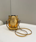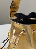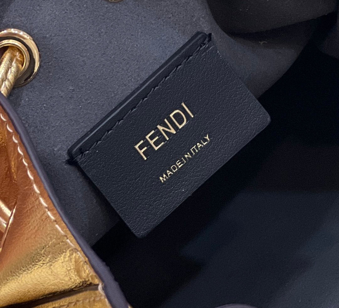Small Mon Tresor bucket bag in gold, with hot-stamped graduated FND ROMA print. Lined interior and gold-finish metalware. With two detachable shoulder straps, one long and one short for wearing the bag on the shoulder or cross-body.