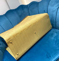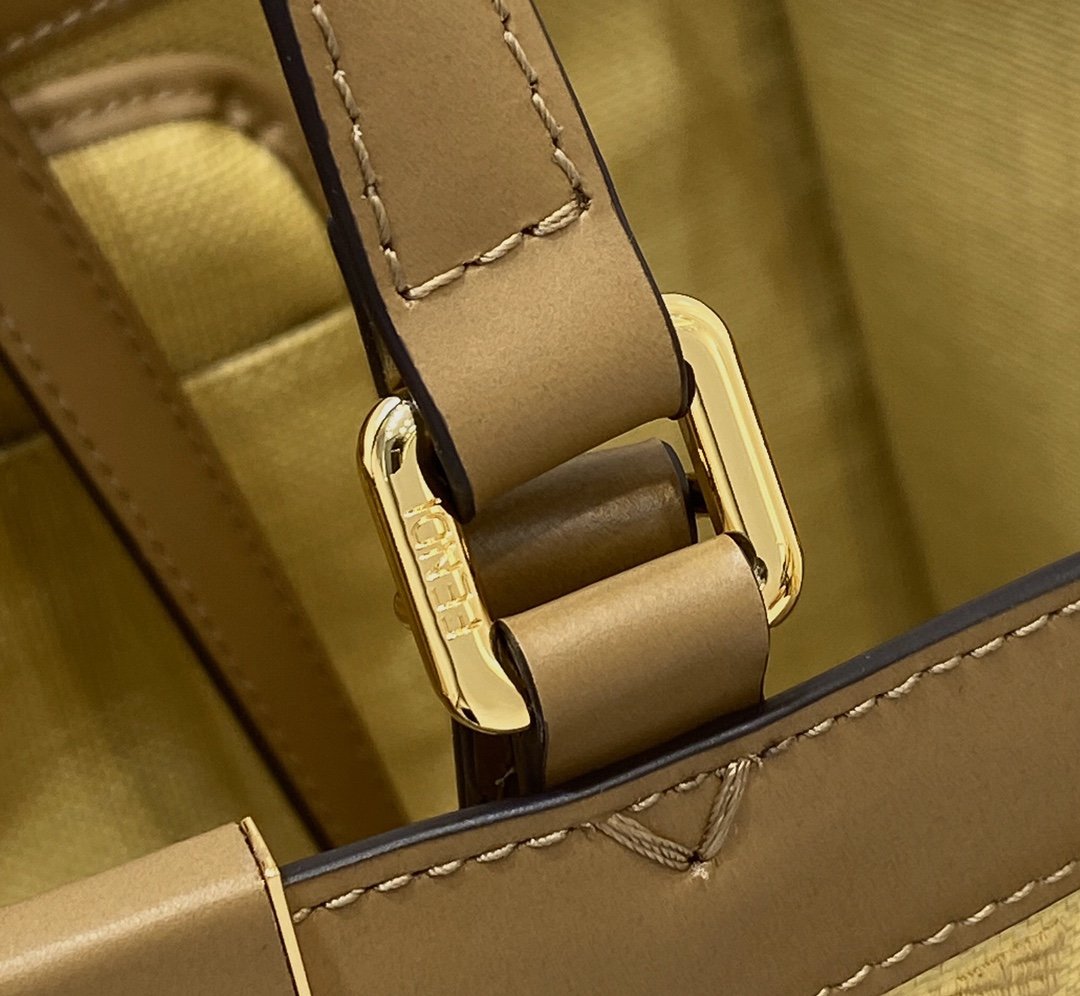 Medium Peekaboo X-Tote with internal pocket and iconic twist lock. With two short handles for carrying by hand and two long handles for wearing over the shoulder. Made of straw canvas. Tone-on-tone embossed and embroidered decorative FF motif.