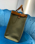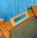 Medium Peekaboo X-Tote with internal pocket and iconic twist lock. With two short handles for carrying by hand and two long handles for wearing over the shoulder. Made of khaki canvas. Tone-on-tone embossed and embroidered decorative FF motif.