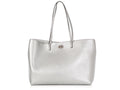 An all-around wonderful tote for travel or running errands�??you will be hard pressed to find a better workaholic than Fendi�??s Silver Carla Selleria! Crafted from thick, grained metallic leather with black glazing, hand-stitched details, and silver logo hardware, this bag features a leather-covered padlock for a measure of security. Twist the turnlock to sneak a peek at the spacious unlined interior with a hanging cell pocket, key ring, and ample room to carry your goodies. The thin leather handles provide you with a comfy carrying drop of 9.75 inches. In excellent condition with a dustbag, clochette, lock, and keys, it has faint rubbing on the corners and a few marks inside. Timeless with iconic style, this shopper is as handy as it is worthy of the fabulous Fendi name!