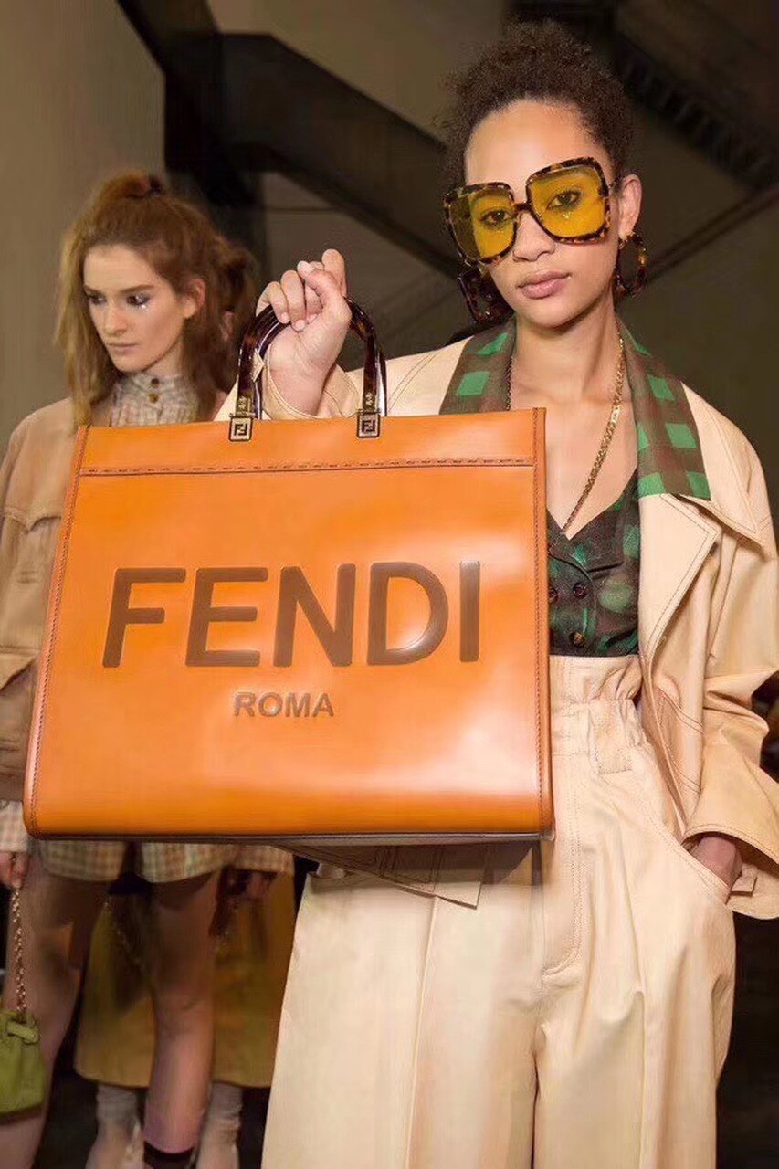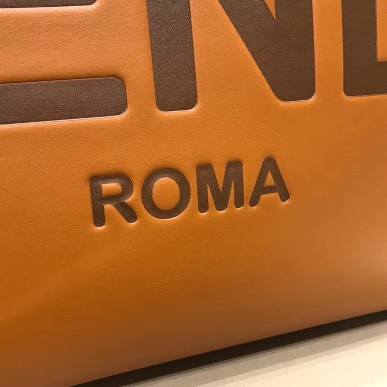 Sunshine Shopper bag made of brown with hot-stamped “FND ROMA” and stiff tortoiseshell plexiglass handles. Equipped with a spacious lined internal compartmtlmt, and gold-finish metalware. Can be carried by hand with the two handles, and two inner hooks allow you to attach a shoulder strap.