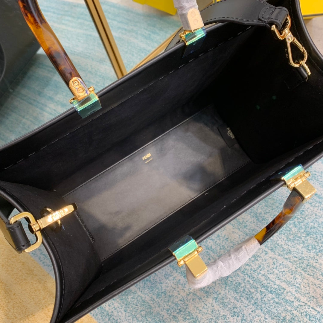 Medium Sunshine Shopper bag made from black with hot-stamped “FND ROMA” and stiff tortoiseshell plexiglass handles. Can be carried by hand or worn on the shoulder thanks to the two handles and detachable shoulder strap.